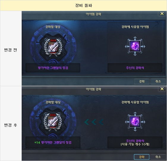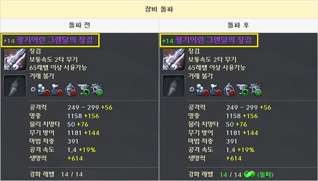 3. 아이템 돌파 후 표시되는 강화 레벨 색상을 초록색으로 변경하였습니다.