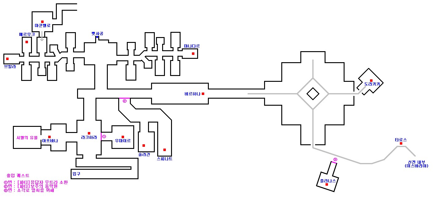넴드 공략은 잘써준 분들이 많아서 생략하구요, 갠적으로 부족하다고 느꼈던 부분을 정리해서 올렸습니다. **파슈만디르 사원 주요 연계 퀘스트 1. 용신도 수송대 수색 2. 불길한 의식 3. [파티]봉인의 수호자 척살 4. 용족 연구가의 조언 5. 용제 기념탑의 탁본 6. [파티]용신도의 고대 문헌 입수 7. 응답자를 부를 재료 8. [파티]응답자 우트라 소환 -> 신탁의 추도실(①번문) 출입가능 9. 고대 문헌 복원 요청 10. 복원에 필요한 재료 11. [파티]보주의 동력원 -> 방치된 보관소(②번문) 출입가능 12. 수정 막대의 동력원 13. [파티]시공의 보주 작동 -> 완료시 빙한의 유폐소(루드라) 출입가능 **상급 스티그마 퀘스트 정확하진 않습니다만, '[미션]시엘의 유물'과 위의 연계퀘스트 중 어느 한단계가 선행퀘인듯 합니다. 저같은 경우는 '[파티]응답자 우트라 소환'을 마치고, '[미션]시엘의 유물'을 완료하니 스티그마퀘가 뜨더군요. '[파티]응답자 우트라 소환'만 완료 했을땐 분명 스티그마퀘가 뜨지 않았습니다. 스티퀘는 아시다시피 30번 반복퀘로서, 아흐바나 불러내는 비석앞의 언데드 드라칸과 드라칸 혼령을 잡는겁니다. **소각로(푸른 화염 플라나스) 출입 퀘스트 ('위미르'에게 습득) 위미르의소원->생명력이강한재료->형상화를돕는재료->성공을부를재료 위의 연계퀘스트를 완료하면 열쇠를 주며, 그 다음부터는 '소각로 열쇠를 위해'라는 퀘스트로 열쇠를 얻을수 있음. **네임드 별 드랍 아이템 (확인된 것만..) - 유저팁의 sharpbow의 글을 참고하였습니다. 추가로 확인차 홈피 '소식란' 검색함. 1.위병대장 라크하라 : 검성견갑,살성장갑,치유신발 2.영혼을 부르는 우마이르 : 없음 3.어둠의 주술사 마쿤벨로 : 검성신발,호법장갑,궁성하의 / 루드라의 장갑(어려움) 4.저주에 걸린 브할라 : 마도신발,수호장갑,치유견갑 5.거대한 메르무크 : 마도견갑,호법신발,검성하의 6.헌신적인 마나다르 : 궁성신발,치유장갑,마도하의 7.예속된 아흐바나 : 궁성장갑,치유하의,정령견갑 / 루드라의 신발(어려움) 8.불사의 스피나트 : 살성신발,호법하의,수호견갑 9.충성스런 술라간 : 수호하의,궁성견갑,마도장갑 10.위대한 비르하나 기념상 : 단도,장검,정령장갑,수호신발,살성견갑 11.대담한 도라키키 : 검성장갑,정령하의 / 루드라의 견갑(어려움) 12.푸른 화염 플라나스 : 머리장식 / 플라나스의 단도,장검(어려움) 13.사로잡힌 용사 타로스 : 정령신발,호법견갑,살성하의 14.봉인의 수호자 이스바리야 : 전직업상의,방패 15.봉인된 폭풍의 루드라 : 검은폭풍의무기,귀고리 / 루드라의무기(어려움)