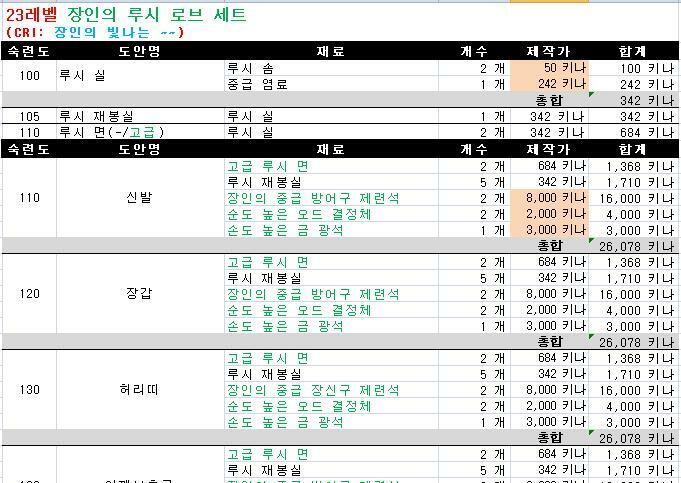 23~38레벨 로브 세트아이템 제작 원가계산 (엑셀)초창기에 만들어놓고 쓰던것인데..