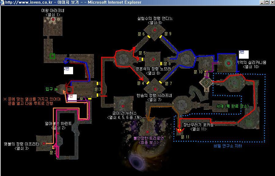 테오보모스를 여러번 달리다보니 나름 생긴 팁을 알려드리겠습니다. 저보다 더 잘 달리는 코스를 아시는분도 계실지 모르겠지만 제가 알고있는 선에서는 최고의 방법입니다. ^^;; 게임을 좀 늦게 시작해서 다른 분들 공략을 보고 큰 도움을 얻었는데.. 아쉬운점은 안가본사람으로서는 이해가 좀 어렵더군요. 그래서 최대한 자세히 설명해볼게요 ^^; (일단 제가 몹이름은 정확히 모르겟네요 대충 이해해주세요...) 입장하시면 버프등 정비를 하시고 득템하러 고고싱~ 1번(붉은색) : 일단 앞에 인간(-_-;;) 2마리랑 살짝 로밍 겔름(?) 한마리가 입구를 지키고 있습니다. 3마리를 모두 잡아도 되지만 이왕이면 겔름 한마리가 최대한 뒤로가면 인간애들을 공격합니다. 모든 공격은 가서하는게 아니라 뒤로 델꼬와서 잡는 형식으로합니다. 그 인간 몬스터는 처음 공격하면 버프를 시전해서 좀 늦게 오니 겔름이 최대한 뒤로가면 바로 불러야 애드가 되지 않습니다. 암튼 이 3마리를 처리합니다. 2번(파랑색) : 달리기 코스입니다. 최대한 그림 대로 벽쪽에 부터서 달립니다. 그림상 문1과 문 3반 앞에 겔름.수호장등이 있는데 이놈들은 애드내지 말고 달리세요~ 이코스는 궂이 수호가 달릴 필요 없습니다. 센스있다면 치유나 호법이 달리는게 오히려 더 낫습니다. 호법의 경우 쾌주 한방 넣고 달리시고 치유의 경우 보호막 키고 달리시면되니다. 물론 타직업도 가능하구요. 2번 지역에 도착하면 돌무더기가 있습니다. 그 위로 올라가면 됩니다. 돌무더기 올라간 다음에는 힐러든 격수든 힐을 바라지 말고 토드 데미지로 생명의 위협이 생기면 반듯이 상치나 물약으로 회복합니다. * 힐을 하면 몹이 달리는 사람 인식한 시간이 그때부터 다시 리셋됩니다. 주의하세요. 캐선을 하시는분들은 잇는데 안해도 무관하지만 불안하면 하셔도되요 저희 팟은 안합니다. 귀차니즘 ;; 암튼 달리기 몹이 돌아가면 녹색 표시한 곳까지 거미 정리합니다. 그다음에 살성이 은신으로 아라크네까지 갑니다. 여기서 살성님의 센스에 따라 시간이 단축 or 지연 될수 있습니다. 여왕아라크네 옆까지가면 바로 옆에서 일단 서있습니다. 아라크네 방에 거미 2마리가 방을 도는데 방의 구조성 3시방향으로 갔을때 살성은 회피 스킬을 시전하고 여왕 공격후 녹색 지점까지 뜁니다. 아시다 싶이 테오 몹 따라오는 길이가 일반 던전 5초보다 길으니 다시 돌아갈까 고민할 필요는 없습니다. 녹색 지점에 도달할 때쯤 석화에 걸리는데.. 석화가 걸리면 녹색지점에서 대기중인 치유가 석화를 풀어주고 살성과 함께 돌무더기 바로앞까지 뜁니다. (살성.치유 모두요) 이쯤되면 아라크네가 녹색지점까지 가는데.. 여왕만 메즈를 걸던지 수호가 포획하면됩니다. 그럼 바로 살성. 치유는 돌무더기로 올라갑니다. 나머지 직업은 아라크네 잡으시고 살성과 치유는 애드된 몹들이 되돌아가면 같이 공격하면됩니다. 애드된 몹들이 돌아가기전까지 힐은 안하는게 좋습니다. 에이귀찮아 걍잡을래 하시는분들은 녹색지점부터 걍 하나씩 처리하면서 잡아도 무관합니다. 아라크네를 잡고 열쇠를 획득하면 2번 지역(갈색)부터 다시 달립니다. 1번(붉은색) 네모 바로뒤 돌무더기 구멍까지 달립니다. 이때 문1과 문3 방을 와따까따하는 겔름 2마리를 애드내는 분이 계시는데 애드나지 않게 조심합니다. (갈색) 그림 처럼 벽에 착달라부터서 뛰시면 절대 애드안납니다. 겔름은... 입구 돌무더기에서 애드가 풀리면 보라색 경로를 딸라 문1까지 몹을 처리하면서 갑니다. 보라색 경로로 이동하면 순 박쥐가 한마리잇는데.. 이놈만 조심하면 위험할거 없습니다. 문 1번 앞에 인간몹은 반듯이 뒤로 끌고와서 잡습니다. 문 1번을 열면 다시 달리깁니다. 핑크색을 따라 뛰시면됩니다. 그림상 문 2이를 지나서 더 가는데 그건 수호만 가면됩니다. 다른 직업들은 바로 문 2번앞에서 리스하면됩니다. 수호는 좀더 앞으로갔다가 애드가 안나는 문2지역에서 자살하시면됩니다. 수호 혼자 좀더 앞으로 가는 이유는 걍 서서 대미지 받으면 타 케릭들이 캐선하기전에 누울수있음이니 반듯이 좀더 앞으로 갔다가 다시 돌아오시면 대미지를 좀더 줄여서 파티원이 캐선할 시간을 벌 수 있기 때문입니다. 캐선한 분들은 봐로 들어오지말고 수포드를 사라지는 시간이 좀 되니 2~4분정도 물좀 버리고 물좀 마시고 오시면됩니다. 괜히 무한 리스 실수해서 수포를 인식시키면 사라지는 시간이 길어집니다. (몹이 돌아고 남은 수포가 몇없다면 그냥 잡으셔도 무관합니다.) 수포가 사라지거나 사냥 후 수호 및 실수로 누우신분들 부활(부활은 치유의 부활의 은총으로 부휴가 반으로 줄어요~)하고 2번문 앞에서 와따가따하는 수포가 문에서 보는 방향향에서 조금 오른쪽으로 가면 바로 잡습니다. 그리고 얼어붙은 하린트가 문까지오면 문방향으로 보게하고 잡습니다. (이래야 하린트가 도망가도 애드가 안됩니다.) 열쇠먹으면 열쇠 열고 이프리타 근처 고대 정령 부터 잡고 순 잡던지 타이밍보고 이프리타 잡으시면됩니다. 메즈되니 애드가 많으면 이프리타를 메즈거세요. 이프리타가 소환하는 정령을 1순위로 잡으시면 무난하실겁니다