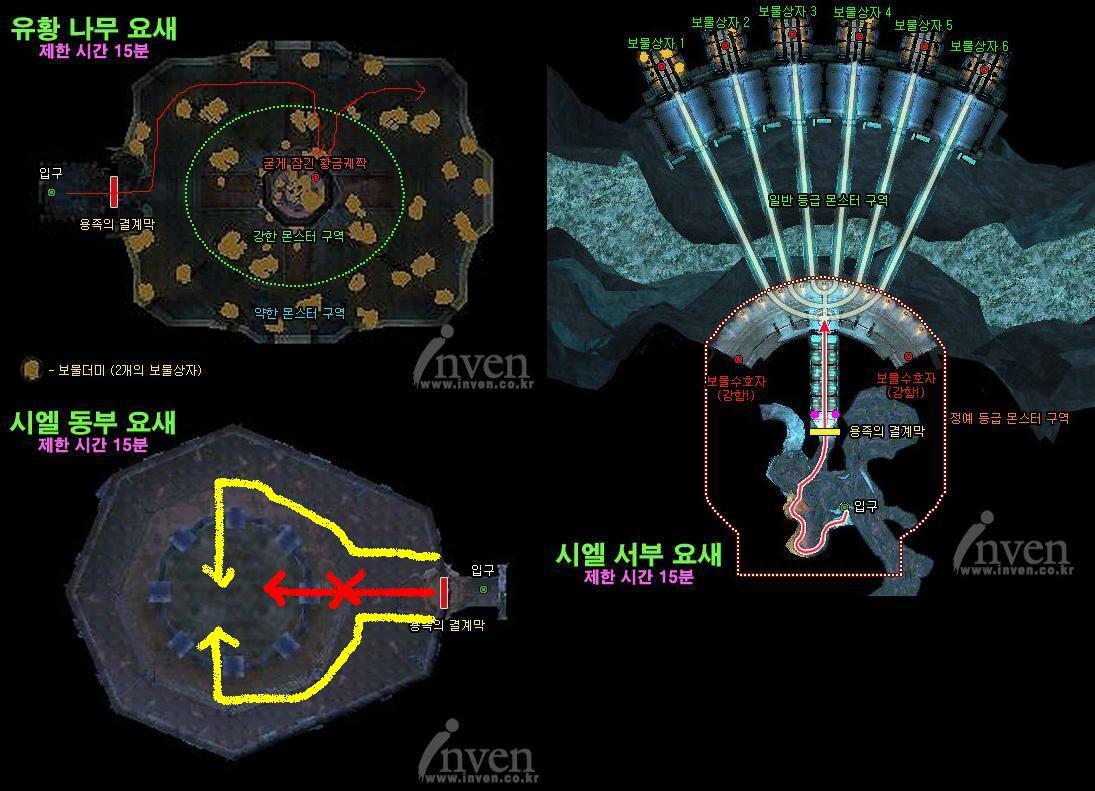 ㅡㅡㅡㅡㅡㅡㅡㅡㅡㅡㅡㅡㅡㅡㅡㅡㅡㅡㅡㅡㅡㅡㅡㅡㅡㅡㅡㅡㅡㅡㅡㅡㅡㅡㅡㅡㅡㅡㅡㅡㅡㅡㅡㅡㅡㅡㅡㅡㅡㅡㅡㅡㅡㅡ - 어비스 하층 인던 공략 (유황 나무 요새,시엘의 서부 요새,시엘의 동부 요새) - 작성자 : 남련 , 사크미스 서버 마족, 대망 레기온 군단장 ㅡㅡㅡㅡㅡㅡㅡㅡㅡㅡㅡㅡㅡㅡㅡㅡㅡㅡㅡㅡㅡㅡㅡㅡㅡㅡㅡㅡㅡㅡㅡㅡㅡㅡㅡㅡㅡㅡㅡㅡㅡㅡㅡㅡㅡㅡㅡㅡㅡㅡㅡㅡㅡㅡ 입장 조건 : 레벨 30이상. 입장퀘스트 없음. 바로 입장 가능. 인던 정보 : 35렙의 정예몹(시엘의 서부요새는 +일반몹,퀘스트보스몹)이 서식한다. 성가신 드레이키도 덤으로 서식한다. 한두대에 죽으며 상자를 여는 유저 방해 및 캐스팅을 끊는다. 성가신 드레이키때문에 정예몹이 애드나는 경우는 없다. 30~44레벨의 유저에게만 아이템을 드랍한다 (퀘스트 템 제외) 인던의 특징 : 보물상자를 열었을때 퀘스트 템, 공훈 훈장, 어비스포인트로 바꿔주는 희귀아이템들을 먹을수 있다. 하급,중급,상급,최상급 고대의 성상,인장,성배,왕관 아이템들이다. 이 아이템들은 NPC에게 300~9600사이의 어비스포인트로 바꿀 수 있다. 신룡퀘의 재료인 조각들도 요새 인던에서 먹을 수 있다. * 신룡무기&방패 : 크세노폰,베토니 다음의 유일템 퀘스트. 48레벨의 유일 아이템. 무기에는 공속옵션이 붙어있으며 방패에는 적대치감소,증가옵션이 붙어있다. 인던 입장시 주의점 : 용족의 결계막을 지나가면 15분 카운트 다운이 시작되고 15분이 지나면 모든 보물상자가 사라진다. 몹들은 그대로 있다. 모든 용족몹이 용족템을 드랍하고 희귀템 및 전승템을 드랍한다. (에레슈란타의 ~~~의 이름을 가진 전승템은 거래불가템이니 주의할 것) 알아두면 좋은점 : 각 요새 인던의 입구에 인던에 입장하여 깰 수 있는 반복퀘스트를 주는 NPC들이 존재한다. 버프요리 및 주문서가 있으면 조금 더 빠른 진행이 가능하다. 모르면 손해보는점 : 성배,왕관은 각 종족의 어비스거점의 NPC에서 바꾸는것보다 어비스 심층의 NPC들에게 바꾸는 것이 더 좋습니다. (+50%의 어포) ㅡㅡㅡㅡㅡㅡㅡㅡㅡㅡㅡㅡㅡㅡㅡㅡㅡㅡㅡㅡㅡㅡㅡㅡㅡㅡㅡㅡㅡㅡㅡㅡㅡㅡㅡㅡㅡㅡㅡㅡㅡㅡㅡㅡㅡㅡㅡㅡㅡㅡㅡㅡㅡㅡ 1. 유황 나무 요새 인던 : 유황 나무 둥지 특징 : 일반 보물상자 외 그보다 더튼튼한 굳게 잠긴 황금궤짝이 존재한다. 굳게 잠긴 황금 궤짝에는 어비스포인트로 바꿔주는 보상아이템이 여러개가 들어있다.(평균3~6개) 군데군데 용족정예몹이 1~2마리씩 위치하고있으며 그 중간중간을 로머한마리가 지나다닌다. 중요사항 : ★ 황금궤짝을 빠르게 부술 수 있는 직업은 궁성과 살성이다. 이유는 밑의 공략에서 설명하겠습니다. ㅡㅡㅡㅡㅡㅡㅡㅡㅡㅡㅡㅡㅡㅡㅡㅡㅡㅡㅡㅡㅡㅡㅡㅡㅡㅡㅡㅡㅡㅡㅡㅡㅡㅡㅡㅡㅡㅡㅡㅡㅡㅡㅡㅡㅡㅡㅡㅡㅡㅡㅡㅡㅡㅡ 처음에 입장하면 시계방향으로 도는게 좋습니다. 용족의 결계막을 지나면 바로 정예몹 로머 한마리가 있습니다. 그것을 빠르게 처리한후 바로 왼쪽으로 붙어서 돌아줍니다. (스크린샷의 빨간줄 참조) 대형애드만 조심하면 레벨 40이하 4~6인팟으로 3마리까진 죽지않고 사냥가능. 사실상 유황 나무 요새 인던은 몹이 띄엄띄엄 배치되어 있어서 애드날 확률이 적습니다. 보물상자는 한명이 전담해서 계속 까는게 좋구요. 정예몹을 다른팟원들이 잡을때 보물상자 전담이 주위에 배치된 보물상자를 애드가 안나는거리에서 모조리 엽니다. 유황 나무 요새 인던 보물상자에서 나오는 희귀(초록색아이템)템은 주사위 굴리기로 분배가 가능하므로 주사위 굴리기로 분배합니다. 대부분은 올주 방식을 택하죠. 이렇게 빨간줄대로 가다보면 무난히 일반 보물상자를 열면서 굳게 잠긴 황금궤짝까지 도달 할 수 있습니다. 이 황금궤짝은 정말 튼튼해서 부수기 힘듭니다. ★ 대부분의 공격은 데미지 1을 주므로 살성유저들은 스킬을 쓰는것보다 평타로만 2타씩 때리는게 더빠르다 하지만 이 궤짝을 빠르게 부수는 방법이 존재한다. 대략 경험해 보았을때 자세하지 않지만 한방공격만으로 데미지 2000을 혹은 그 이상을 넘기는 스킬 공격이 궤짝에게 큰 타격을 주는것 같다. 격수들의 신성력 공격스킬이 치명타 공격이 터졌을때 상자의 체력이 1이상으로 깎이는것을 볼 수 있다. 하지만 궁성,살성 외에 다른 격수들의 신성력 공격스킬은 대부분 크리가 뜨지않으면 1데미지를 주거나 조금의 데미지를 준다. 궁성의 1이상의 데미지를 입힐 수 있는 스킬은 궁수의 강습-파열 스킬이다. 궁수의 강습화살,파열화살 스킬은 한방 데미지가 아주 크다. 필자의 37레벨 궁성으로 강화의눈,전념 스킬 시전후+공격력을 올려주는 스테이크 음식을 먹은상태에서 강습화살,파열화살을 썼을때 치명타가 터지면 굳게 잠긴 황금궤짝에게 데미지 1000이상을 준다. 게다가 이번패치로 인해 강습화살의 쿨이 12초로 줄었으므로 다른캐릭의 신성력스킬 사용은 제한되 있는 반면 궁성은 12초마다 한번의 기회가 돌아오는 것이다. 공격력,치명타가 부족한 궁성들의 경우는 어떨지 모르겠으나 본인의 37궁성으로는 혼자 굳게 잠긴 황금궤짝을 까는데 1분도 걸리지 않았다. 당시 제 사크미스 서버 37궁성 남련