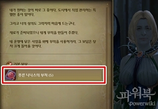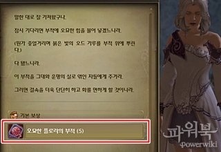 플로라에게 가서 준비한 오드 가루와 키나를 지불하면 부적 5장을 보상으로 받는다.