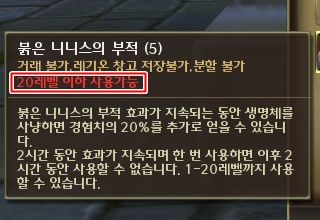 | 붉은 니니스의 부적 | 붉은 니니스의 부적 효과가 지속되는 동안 생명체를 사냥하면 경험치의 20%를 추가로 얻을 수 있습니다. 2시간 동안 효과가 지속되며 한 번 사용하면 이후 2시간 동안 사용할 수 없습니다. 1-20레벨까지 사용할 수 있습니다. | ||||