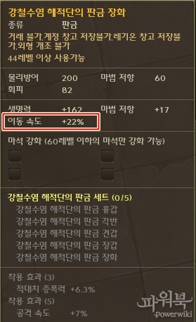 기존의 세트 효과로 추가되던 이동 속도 옵션이 각 재질 별 신발로 옮겨가면서 세트 장비 시의 풀 세트 효과도 변경된다. 자세한 변경 사항은 다음의 표에서 확인할 수 있다.