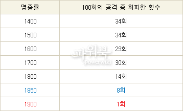 실험은 명중률을 1400 ~ 1900까지 조절하며 각각 100회씩의 공격을 칼린디에게 사용한 후, 공격이 빗나간 횟수를 체크하였다.