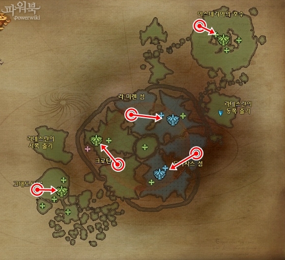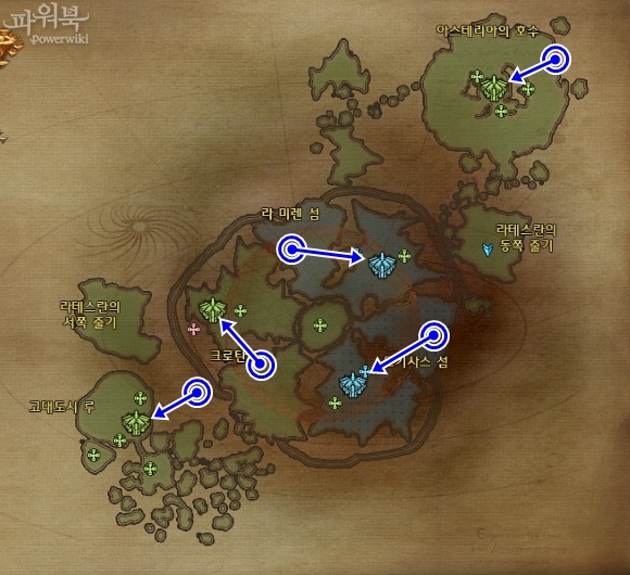 고대도시 루와 아스테리아의 호수에 있는 수호탑은 요새의 소유 종족과 상관 없이 아래에 표시된 곳에 고정적으로 위치하고 있다. 반면, 중앙에 있는 3개의 섬에 있는 수호탑은 요새를 마족이 소유했을 때(요새를 용족이 소유했을 경우에는 세력 비율에 따라 변경) 천족의 수호탑이 나타난다. 위치는 아래의 맵을 참조하자.