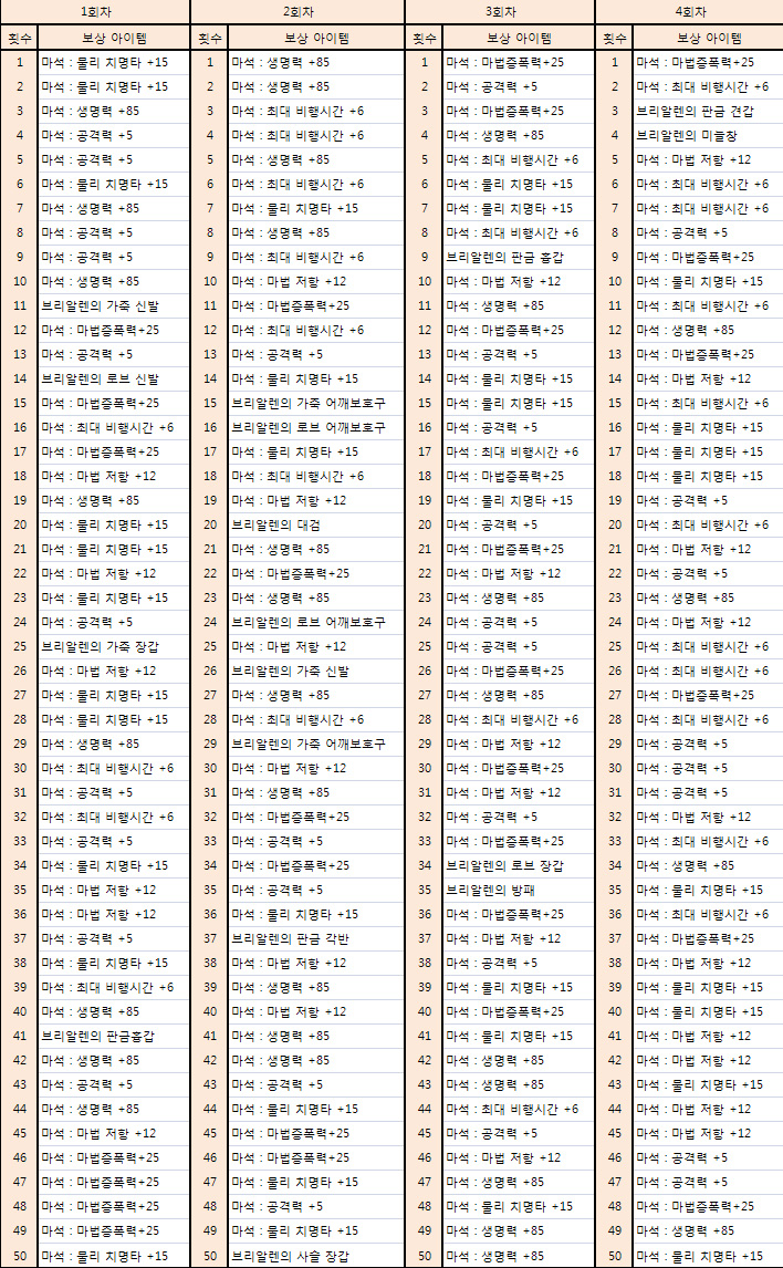 실험 방법 지하요새에 감추어진 물건 퀘스트를 50회씩 4번 완료하고, 1회 완료시 얻게되는 보상 아이템을 모두 기록한다.