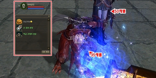 35레벨 살성과 50레벨 치유성이 파티로 붙어 있지만, 살성이 연 보물 상자에서 아이템이 나왔다