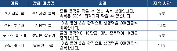 아래는 특정 버프를 받을 수 있는 구조물의 리스트로, 포구스 통구이와 과일 바구니는 1회만 사용이 가능하다.
