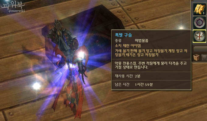 이동 중 낡은 유물상자 안에서 폭발 구슬이라는 아이템을 얻을 수 있는데, 이 아이템을 퀵바에 등록한 후, 클릭하면 강력한 범위 스킬을 사용할 수 있다. 이 아이템을 하나 얻는 것만으로도 공략의 난이도가 대폭적으로 낮아지니 반드시 얻길 바란다.