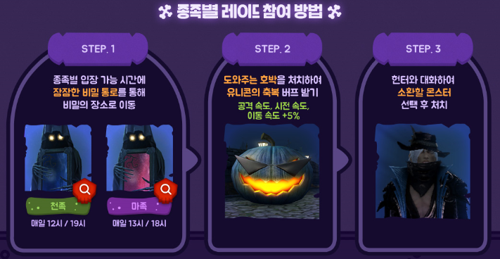 - Step 3. 입구를 통해 중앙으로 이동 후 헌터와 대화하여 소환할 몬스터 선택 후 처치 ![]() (!) 종족별 레이드 진행 시 [이벤트/주간/연합] 숨겨진 장소에 나타난 으스스 퀘스트를 함께 진행하세요. (!) 상대 종족의 레이드 진행 시 입장하여 방해하는 호박을 처치하면 상대 종족을 방해할 수 있습니다. [경쟁형 레이드] → 천족과 마족이 정해진 시간에 비밀의 장소로 이동하여 서로를 견제하며 레이드 진행 - Step 1. 매일 21시에 등장하는 오싹한 비밀 통로를 통해 비밀의 장소로 이동- Step 2. 상대 종족을 견제하며 광장 중앙에 서있는 헌터 처치 - Step 3. 헌터 처치 후 광장 중앙에 등장하는 팬텀 처치 [단서 수집 퀘스트] → 단서를 10개 수집하여 조립 시 [이벤트] 단서 수첩 또는 [이벤트] 완벽한 단서 수첩을 획득 - Step 1. 드마하 스텔루시아에 등장한 꼬마 유령과 대화하기 - Step 2. [이벤트/일일/파티] 드마하에 나타난 으스스 군단 퀘스트 획득 - Step 3. 매시 정각에 드마하 곳곳에 등장하는 몬스터 군단장 중 하나 처치