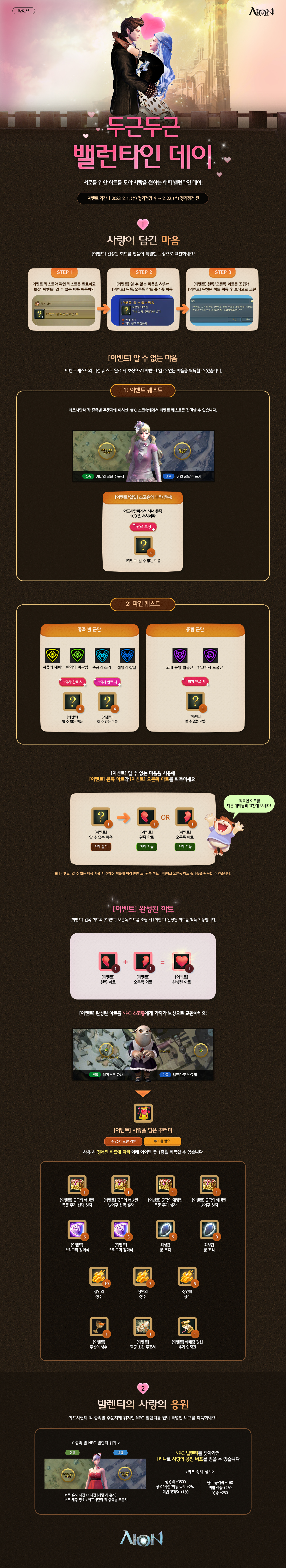 두근두근 밸런타인 데이 이벤트 안내※ 주의사항 1. 본 이벤트는 아이온 이벤트 규약을 따릅니다. 2. 제재된 계정 및 클래식 서버 캐릭터는 참여가 불가능합니다. 3. 초코송 NPC는 2023년 2월 22일(수) 정기 점검 시점에 삭제됩니다. 4. 발렌티 NPC는 2023년 2월 22일(수) 정기 점검 시점에 삭제됩니다. 5. 초코룽 NPC는 2023년 3월 2일(목) 정기 점검 시점에 삭제됩니다. 6. [이벤트] 알 수 없는 마음, [이벤트] 왼쪽 하트, [이벤트] 오른쪽 하트, [이벤트] 완성된 하트, [이벤트] 사랑을 담은 꾸러미는 2023년 3월 2일(목) 정기 점검 시점에 삭제됩니다. 7. [이벤트] 왼쪽 하트, [이벤트] 오른쪽 하트는 거래 및 판매 대행 등록이 가능합니다. 8. [이벤트]가 적용된 아이템은 공지 후 삭제될 수 있습니다. 9. 각 아이템마다 거래 속성이 다르므로 아이템 속성 확인에 주의하시기 바랍니다.