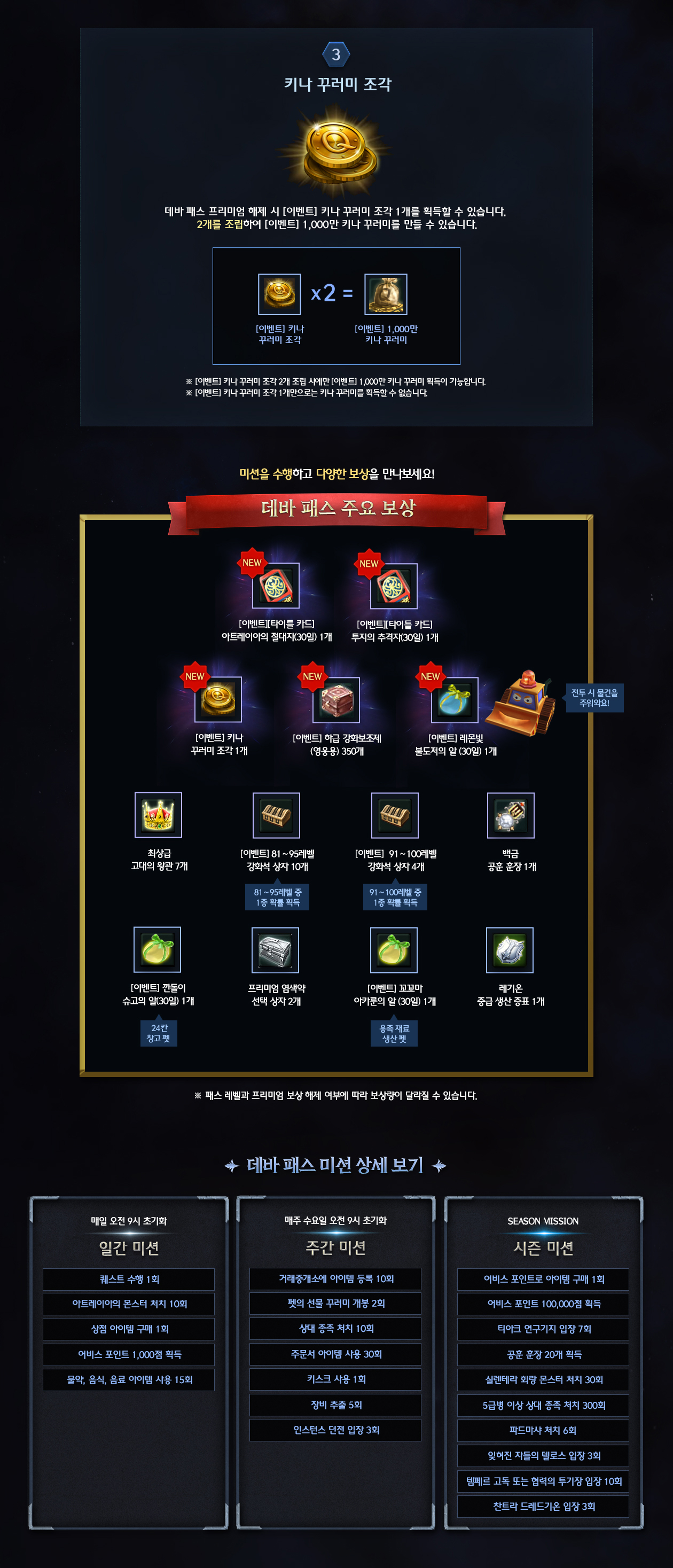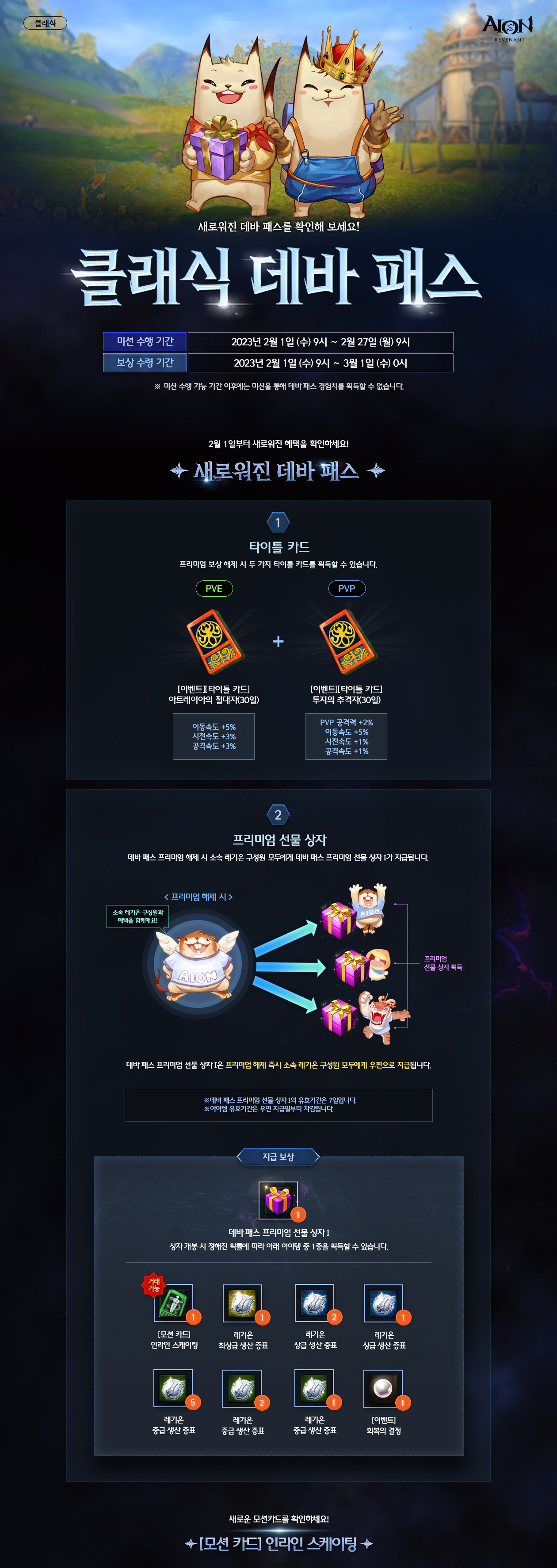 클래식 데바 패스 갱신 안내데바 패스의 자세한 설정은 가이드북에서 확인하실 수 있습니다. ※ 주의사항 1. 테스트/라이브 서버 고객 및 제재된 계정은 참여가 불가능합니다. 2. 데바 패스 프리미엄 보상 해제 전 기본/프리미엄 보상의 아이템 속성을 반드시 확인해 주시기 바랍니다. 3. 본 프로모션의 경우 추후 동일하거나 유사한 형태로 다시 진행될 수 있습니다. 4. 본 프로모션은 조기 종료되거나, 기간이 연장될 수 있습니다. 5. 데바 패스 레벨 업 및 프리미엄 보상 해제로 소모된 큐나는 복구 불가능합니다. 신중하게 선택 바랍니다. 6. 데바 패스 시즌 기간 내 도달하지 못한 데바 패스 레벨의 보상은 획득 불가능합니다. 7. 데바 패스 레벨 달성 후 획득하지 않은 보상은 시즌 종료 이후 우편함으로 일괄 배송 됩니다. 8. 데바 패스 프리미엄 보상 해제를 진행한 경우, 다음 데바 패스 시즌 시작 시 레벨 8부터 시작할 수 있습니다. 9. [데바 패스 프리미엄 선물 상자I]의 우편 보상 수령 기간은 7일이며, 수령한 보상 아이템의 유효기간은 우편의 수령 기간을 공유합니다. 10. 확률형 보상 아이템 정보는 클래식 N샵 공지에서 확인하실 수 있습니다. 11. 본 이벤트는 아이온 이벤트 규약을 따릅니다. 12. 일부 프로모션 영상/스크린샷은 라이브 서버에서 촬영되었습니다. 참고 부탁드립니다. 13. 본 프로모션에서 판매되는 모든 상품은 추후 동일 또는 유사한 상품으로 다시 판매될 수 있습니다.