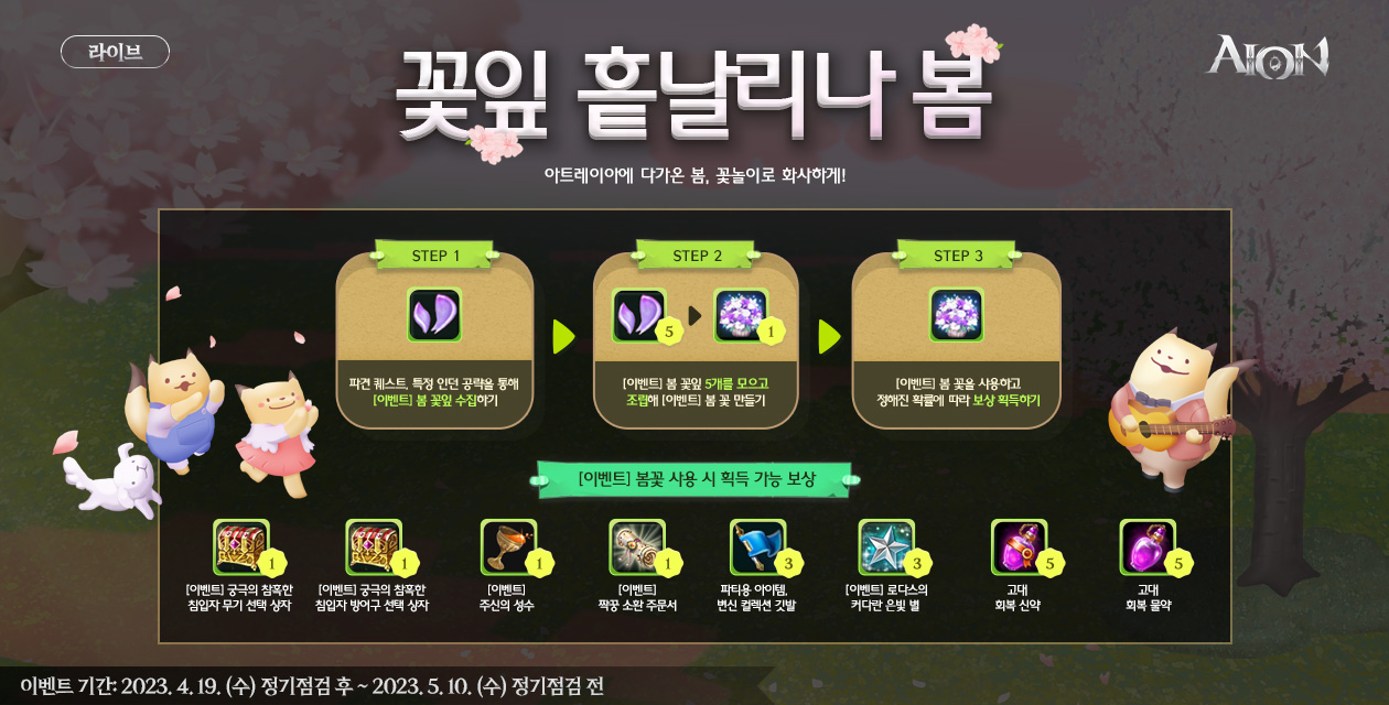 꽃잎 흩날리나 봄 이벤트 안내아이온 가족 여러분, 안녕하세요. 4월 19일(수)부터 ‘꽃잎 흩날리나 봄’ 이벤트가 시작됩니다. 3주간 파견 퀘스트와 인던 공략 등을 통해 [이벤트] 봄 꽃잎을 획득할 수 있으며 5개 조립 시 다양한 아이템 중 1개를 획득할 수 있는 [이벤트] 봄 꽃 아이템을 획득할 수 있습니다. 꽃잎 흩날리나 봄 이벤트 ● 이벤트 기간 -2023. 4. 19.(수) 정기 점검 후 – 5. 10.(수) 정기 점검 전까지 ● 이벤트 진행 방식 -이벤트 기간 동안 파견 퀘스트와 인던 공략을 통해 [이벤트] 봄 꽃잎 아이템을 획득할 수 있습니다. -[이벤트] 봄 꽃잎 5개를 조립하면 [이벤트] 봄 꽃 아이템을 획득할 수 있습니다. -[이벤트] 봄 꽃 사용 시 다양한 아이템 중 정해진 확률에 따라 1개의 아이템을 획득할 수 있습니다. 자세한 이벤트 세부 내용은 다음 가이드에서 확인할 수 있습니다. ※ 주의 사항 1. 본 이벤트는 아이온 이벤트 규약을 따릅니다. 2. 제재된 계정 및 클래식 서버 캐릭터는 참여가 불가능합니다. 3. [이벤트[ 봄 꽃잎. [이벤트] 봄 꽃은 2023년 5월 17일(수) 정기 점검 시점에 삭제됩니다. 4. [이벤트]가 적용된 아이템은 거래 불가, 판매 대행 등록 불가입니다. 5. [이벤트]가 적용된 아이템은 공지 후 삭제될 수 있습니다. 6. 각 아이템마다 거래 속성이 다르므로 아이템 속성 확인에 주의하시기 바랍니다. 고맙습니다.