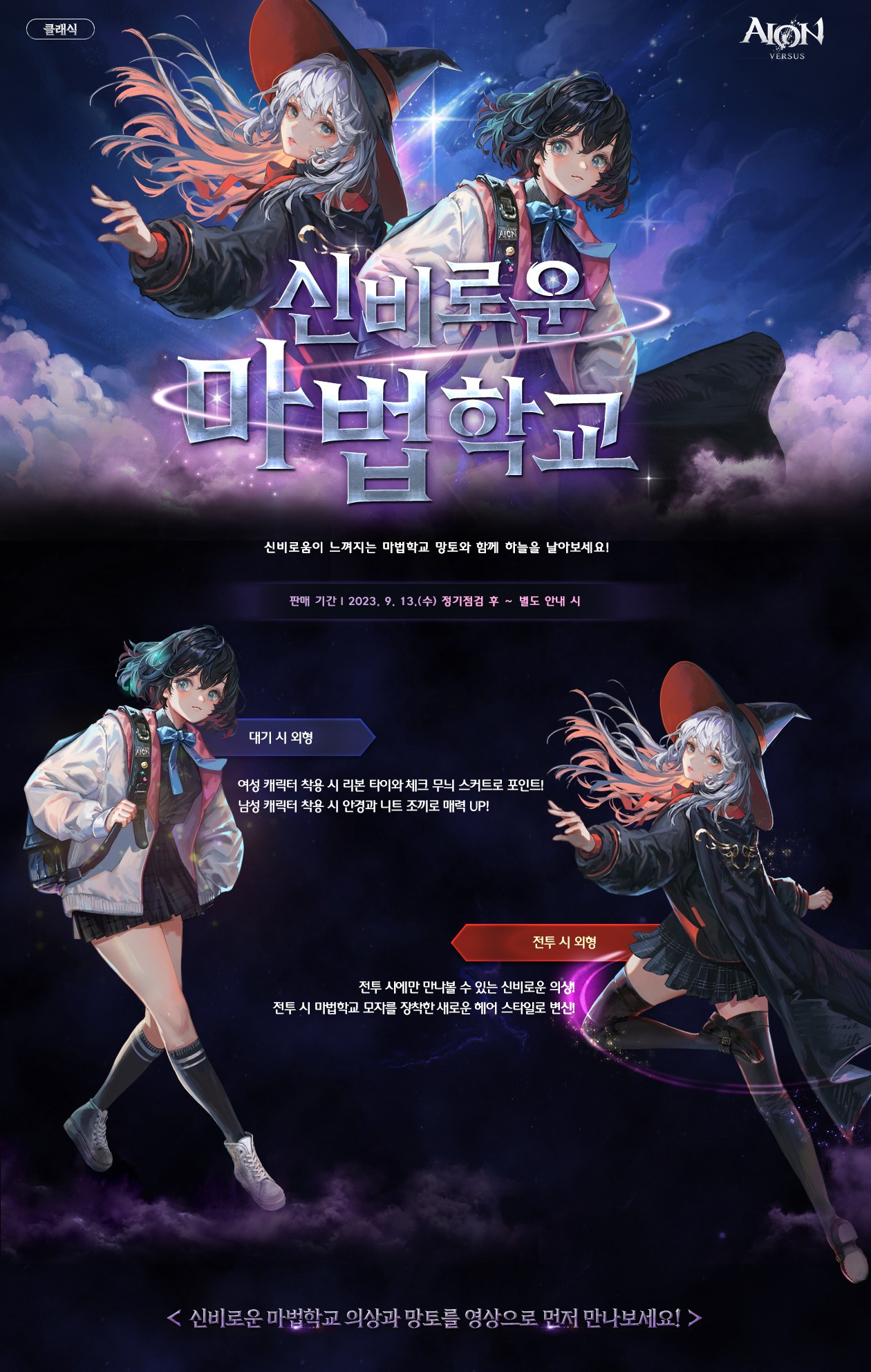 신비로운 마법학교 의상 출시 안내※ 주의사항 1. 본 아이온 이벤트는 아이온 이벤트 규약에 따릅니다. 2. 제재된 계정 및 라이브 서버 캐릭터는 참여가 불가능합니다. 3. 클래식 프로모션에서 판매하는 상품은 클래식 서버 전용 상품입니다. 4. 구매하시는 아이템의 속성을 반드시 확인해 주시기 바랍니다. 5. 본 프로모션에서 판매되는 모든 상품은 추후 동일 또는 유사한 상품으로 다시 판매될 수 있습니다. 6. 본 프로모션은 조기 종료되거나, 기간이 연장될 수 있습니다. 7. 일부 장비의 경우 외형 변경이 불가능하오니 장비 별 속성을 확인 부탁드립니다. 8. 각 아이템마다 거래 속성이 다르므로 아이템 속성 확인에 주의하시기 바랍니다.