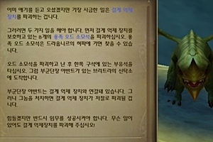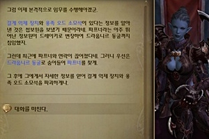 오드 폭탄을 가지고 다시 벨루스란으로 돌아와 네르투스에게 말을 걸면 용족의 근거지를 염탐하기 위해 첩보원 파프너를 파견했다고 한다. 파프너는 드레이키로 위장해서 잠입했는데, 그 동안 많은 정보를 보냈는데 갑자기 연락이 두절됐다고 한다. 네르투스는 우선 드라웁니르 동굴로 잠입해서 파프너를 찾고 난 뒤, 그에게서 자세한 정보를 얻어 결계 억제 장치와 용족 오드 소모석을 파괴하라고 한다. 4. 드라웁니르 동굴 내 NPC 파프너와 대화