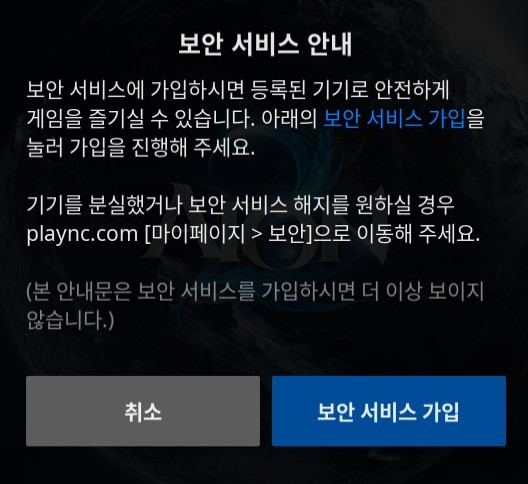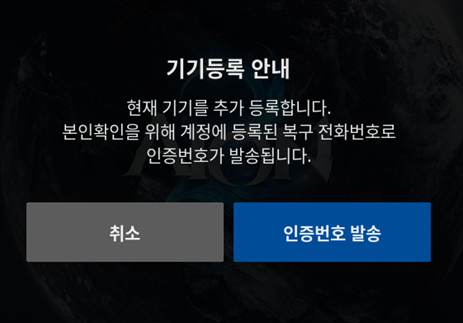 PC환경 필수 보안서비스(기기 등록) 방법 안내두 개의 하늘, 하나의 영광 안녕하세요, 데바 여러분! AION2입니다. PC 퍼플 런처로 AION2 접속 시 필수로 가입해야 하는 기기등록 보안 서비스에 대해 안내 드립니다. 보안 서비스 (기기 등록) 가입을 진행하지 않으실 경우, 게임 접속이 제한되는 점 양해 부탁드립니다. 안전하게 게임을 플레이하실 수 있도록 아래 내용을 참고하시어 꼭! 기기 등록을 진행해주시길 권해드립니다. ■ 기기 등록 방법 안내 1. 게임 접속 후 메인 화면 좌측 하단의 ‘보안 설정’ 버튼 클릭. 2. 인증 수단 중 기기 등록 선택. (집 또는 자주 사용하는 PC의 경우 기기등록을 진행하시길 권장합니다.) 3. 보안 서비스 안내 내용 확인 후 '보안 서비스 가입' 버튼 클릭 4. 본인 확인 진행 - 4-1. 계정에 등록된 복구 전화번호가 없을 경우 - 계정에 등록된 복구 전화번호가 존재할 경우 5. 기기 명칭을 설정하시고 등록 버튼을 누르시면 기기 등록이 완료됩니다. 6. 기기 등록이 완료된 경우, 게임 접속 화면에서 보안 설정에 등록 중으로 표시됩니다. 기기 등록 상태는 로그인 시점에만 갱신됩니다. 게임 내에서 기기 등록을 진행하신 경우, 변경 사항 반영을 위해 재로그인을 해주셔야 합니다. 이 점 양해 부탁드립니다. 기기 등록 서비스를 통해 안전하게 AION2를 즐기시기를 바랍니다. 앞으로도 AION2에 많은 관심과 사랑을 부탁드립니다. 고맙습니다. |