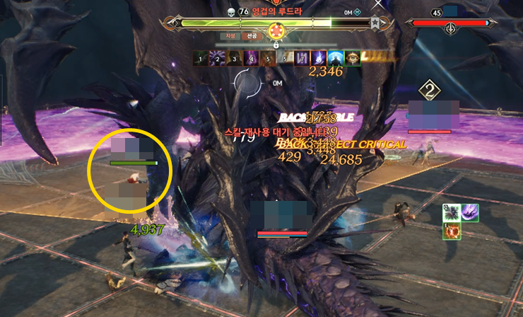 루드라 3네임드 클리어를 위한 패턴별 팁[1페이즈] 1. 꼬리 치기 - 루드라 뒤에서는 모션이 잘 안 보이므로 옆에서 때리는 것도 좋음 - 맞았다면 충격 해제 사용 후 치유 물약으로 출혈 풀어주기 2. 줄넘기 패턴 - 어그로 대상이 스킬로 갑자기 뒤로 이동하면 루드라도 같이 갑작스럽게 머리를 돌리는 경우가 생기니 주의 ㄴ 이때 예상하지 못했던 근접 클래스들이 팔에 찍혀서 참사 나는 경우가 많음 - 구분이 어렵다면 근접 클래스들은 줄넘기 나오기 전에 미리 살짝 빠져있는 것도 좋음 - 줄넘기를 어느 쪽에서 피하느냐에 따라 2번 점프해야 될 때도 있고 점프+활공하면 되는 경우가 있음 ![]() 3. 구슬 패턴 - 빨간색 구슬은 반드시 방어 스킬 있는 클래스가 스킬 사용 후 + 파란색 구슬 처리된 후 먹기 (안 그러면 터짐) ㄴ 검성 ‘집중 막기‘, 호법성 ‘집중 방어’, 살성 ‘회피 자세‘, 수호성 ‘보호의 방패‘ 등 - 빨간 구슬은 루드라의 머리 앞쪽에 생성 ![]() 4. 십자 패턴 - 루드라가 일어서는 전조 모션이 구슬 패턴과 동일하지만 대사가 나오지 않고 주변에 보라색 원이 퍼지면서 시작 - 루드라 몸 주변으로 십자가 한 번 생기므로 근접 클래스는 미리 빠지거나 방어/회피 준비 - 속도가 매우 빠르고 데미지가 강력하니 루드라가 일어서면 항상 신경 써야 함 ![]() 5. 원 구역 생성 후 구슬 + 회오리 패턴 - 보라색 원 구역이 생성 후 루드라가 날면 중앙에서 회오리가 나오니 살짝 빠지거나 방어 스킬 사용 준비 - 데미지가 강력하기 때문에 피해 내성 안 찍은 몸 약한 근접 클래스들 원콤 날 수 있음 ![]() 6. 원 구역 안에서 브레스 - 체력바가 초록색으로 지정된 대상에게 전방 브레스 발사 - 어그로 대상이 된 사람은 최대한 포스원들 없는 쪽으로 가서 편하게 딜 넣을 수 있도록 유도 ![]() 7. 원 구역 안에서 내려찍기 후 장판 - 위 패턴 이후 바로 연계해서 사용. 발로 내려찍고 각 포스원들의 위치에 모두 장판을 떨어뜨림 - 방어 스킬 있는 직업들(특히 살성)은 제자리에서 가만히 막아주는 게 좋음 - 괜히 당황해서 회피하거나 스킬 써서 이동하면 무적기 없는 포스원이랑 겹쳐서 다른 사람 죽일 수 있음 - 해당 패턴 이후 [구슬/회오리 + 브레스] 1번 반복, 이후 원 안에 전체 공격 준비하니 원 밖으로 나가기 ![]() 8. 루드라의 시련 (빙고 패턴) - 빙고판이 생기고 각 포스원의 위치에 장판이 지속적으로 떨어짐 - 빙고판 중 딱 한 곳에 무적 판정 안전지대가 생성되며 그 칸에 장판을 맞춰야만 나타남 (다소 운빨) - 근접 클래스는 중앙부터, 원거리 클래스는 바깥부터 하나씩 까주기 - 아르카니스나 루드라 1네임드와 비슷하게 와리가리 하다 보면 장판이 고정되는 순간이 있으니 그때 피하면 됨 - 패턴이 약 10.5초가 남았을 때 루드라가 빙고판을 대각선으로 가로질러 브레스를 발사함 - 반드시 빙고판 위에 있을 필요는 없음. 빙고판 밖으로 나가도 무방하므로 브레스 피할 때 사용할 것 - 거대 구슬이 땅에 떨어지고 '루드라의 시련' 패턴 타이머가 사라진 다음 바로 안전지대에서 나와도 됨 - 패턴 종료 후 루드라가 10초의 긴 그로기에 걸림 ![]() ![]() ▲ 안전지대가 생성되면 바로 콜해서 모여줘야 한다 [2페이즈] - 빙고 패턴 종료 후 미니맵 기준 12시 방향에 루드라 등장. 미리 가서 때리고 있어야 함 - 맵 밖으로 나가면 지속 데미지 들어오니 주의 1. 지켈 패턴 - 루드라가 공중으로 날아가면 사용 - 지켈과 유사하게 줄 안에 터진 후 안으로 들어가면 됨 - 가로 한 번, 우측 대각선 한 번, 좌측 대각선 한 번 ![]() 2. 줄넘기 패턴 - 루드라 손 쪽에 장판 표시 생기면 줄넘기 시작 - 루드라 바라보는 기준 왼손→오른손 순서로 찍어서 왼쪽보다 오른쪽에서 피하는 게 압도적으로 쉬움 ![]() ▲ 왼쪽에 있으면 2번 점프해야 하지만 오른쪽은 점프+활공으로 바로 회피하고 딜 가능 3. 구슬 + 줄넘기 패턴 - 근접 클래스는 앞쪽 구슬을, 원거리 클래스가 뒤쪽에 생성되는 구슬을 먹어주는 게 좋음 - 1페이즈와 동일하게 파란색 먼저 처리 후 빨간색 나중에 먹기 - 빨간색 구슬 먹는 사람은 줄넘기를 미리 피하고 먹는 게 좋음 (안 되면 그냥 먹고 줄넘기 맞은 다음 힐 케어) ![]() 4. 날개치기 2타 - 방어 스킬로 데미지 무효화 가능 ![]() 5. 머리 흔들고 번개 2회 - 루드라 바라보는 기준으로 루드라가 갑자기 머리를 좌측으로 꺾고 털 준비를 하면 해당 패턴 - 데미지가 매우 강력하니 절대 맞지 말기. 인지만 하고 있으면 생각보다 피하는 건 쉬움 ![]() 6. 좌빨우파 패턴 - 루드라가 파란 구슬과 빨간 구슬을 들고 하나로 합침. 모든 포스원의 몸에 빨간색 또는 파란색 이펙트가 생김 - 서로 다른 색끼리 붙으면 지속 피해가 들어오니 같은 색끼리 한쪽 방향으로 뭉쳐서 떨어져야 함 - 일반적으로 빨간색이 왼쪽, 파란색이 오른쪽이나 서로 소통하여 정하기 - 루드라가 위치를 바꿀 경우 헷갈릴 수 있으므로 약속된 플레이 필요 - 해당 패턴 이후에 지켈 패턴에서 당황하면 폭사날 수 있으니 주의 ![]() 7. 루드라의 시련 (2페이즈 빙고) - 1페이즈와 동일하지만 루드라가 빙고랑 같이 줄넘기를 쓰기 때문에 반드시 루드라를 시야에 두고 대응해야 함 ![]() 8. 우레의 구역 - '존재