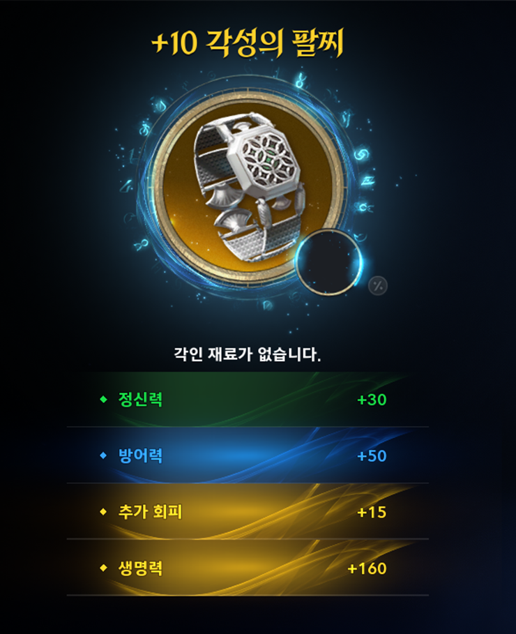 각인이 불가능한 허리띠와 아뮬렛을 제외하고 16부위에 모두 각인을 하면 전승 장비 기준으로도 최소 48, 최대 192의 전투력 상승을 기대할 수 있다. 전부위 유일 장비 기준으로는 최대 256까지 상승한다.