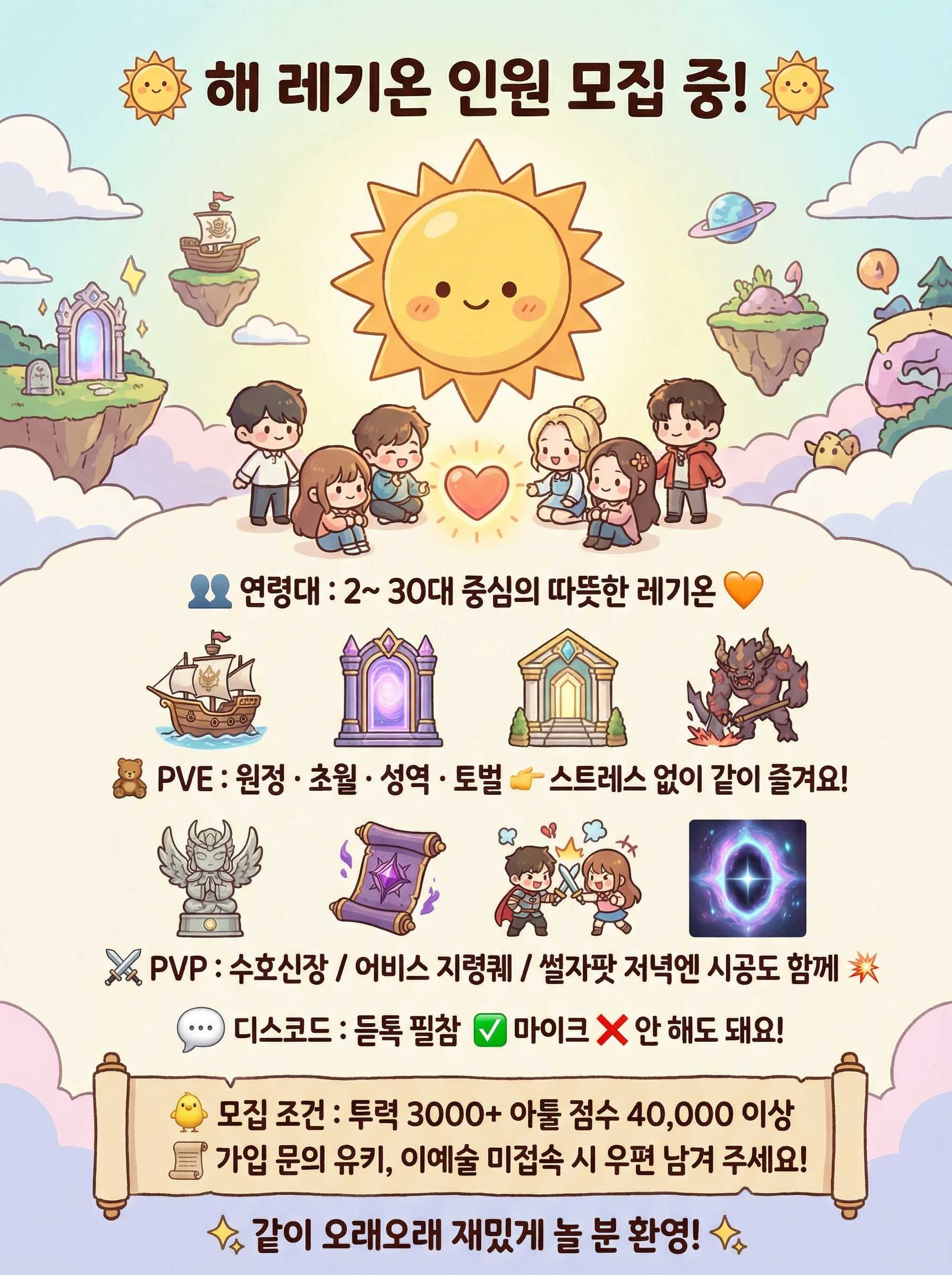 [아리엘] <해> 레기온 인원 모집 중!아리엘 서버의 🌞 해 🌞 레기온에서 함께 성장해 나갈 데바 님들을 모집하고 있습니다! 신규 유저 분들도 따로 모집하고 있으니 즐겁게 활동해 주실 의지만 있다면 ✨️언제든 문의 주세요 ✨️ 미접 시 우편 남겨 주시면 따로 친추나 귓말 드리겠습니다!