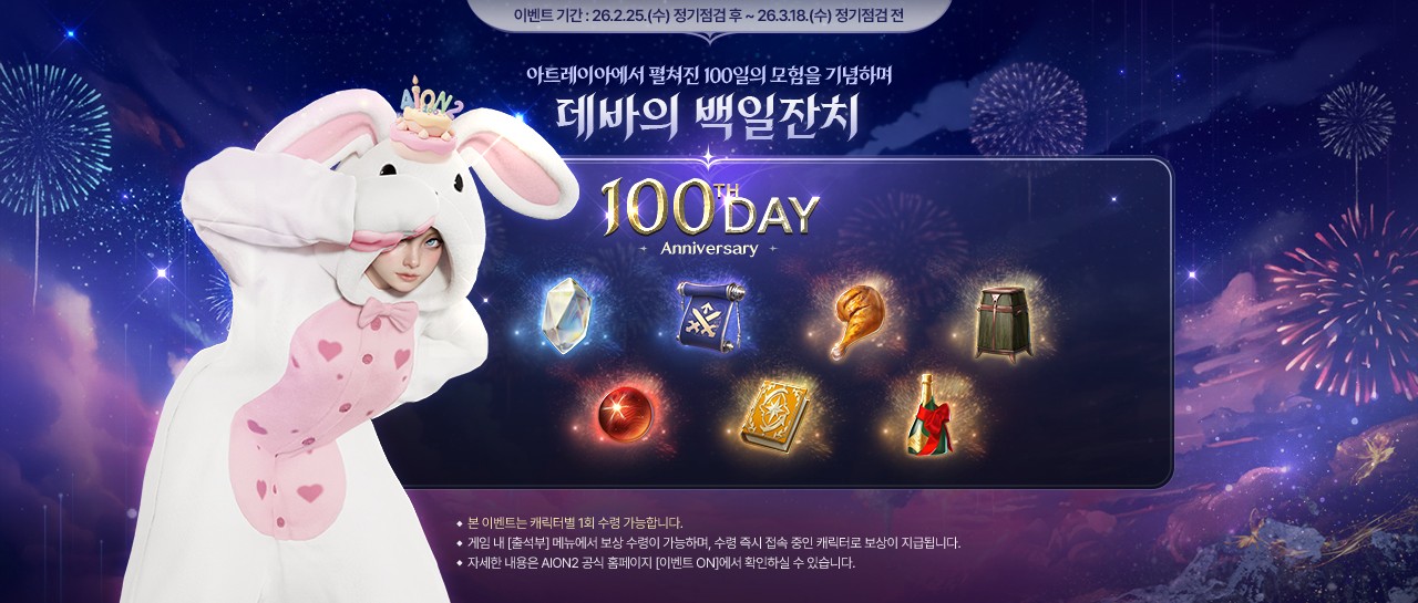 게임정보는 NCER, NCER에서 알려드리는 AION2 게임소식 입니다. 이 답변은 AI가 생성한 정보입니다. 실제 게임 내용과 다를 수 있으며, 정확한 정보는 반드시 공식 채널에서 확인해주세요. 작성 기준일 : 2026.02.25 ■ 이벤트 일정 - 2026년 2월 25일 (수) 정기점검후 ~ 2026년 3월 18일(수) 정기점검전 ■ 이벤트 내용 - 인 게임 메뉴 – 출석부에서 <데바의 백일잔치>보상을 확인하세요. ※ 출석부는 매일 00시 갱신됩니다. ■ 이벤트 보상