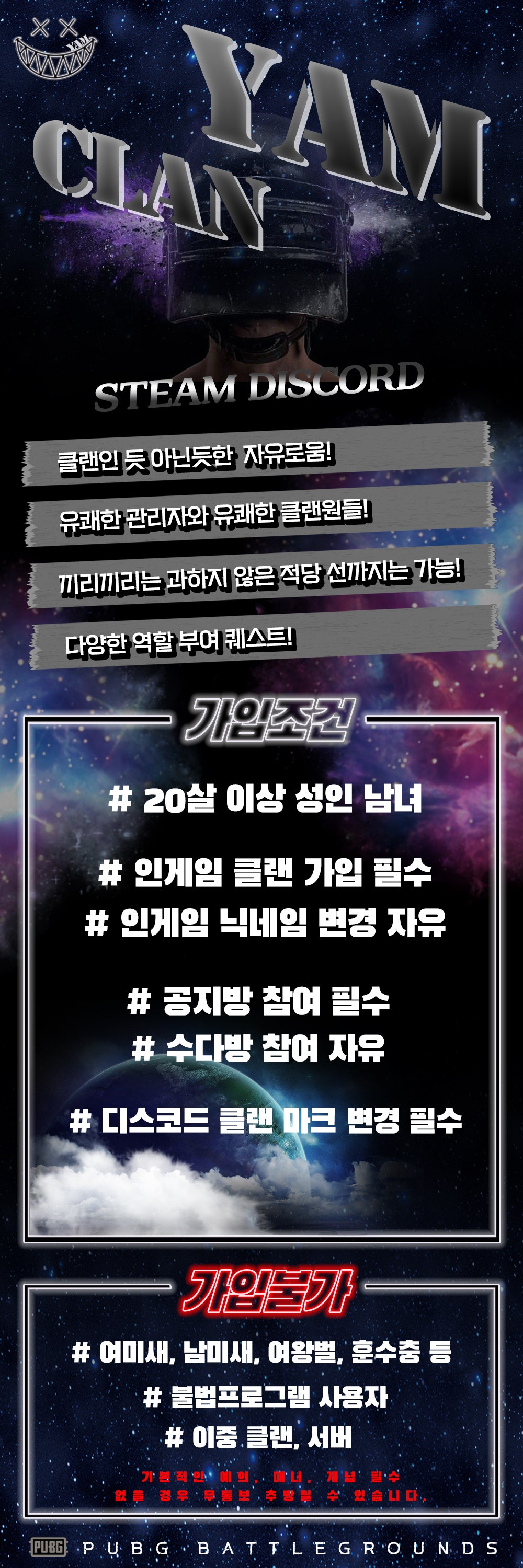 ✨YAM CLAN✨따끈따끈한 클랜ㅣ딜량무관ㅣ인게임 클랜 가입, 디스코드 마크 변경 필수ㅣ인게임 닉변 자유ㅣ오전,오후,새벽반 대대환영ㅣ일겜러 경쟁러 대대환영ㅣ즐빡겜유저 대대환영ㅣ적당한 끼리끼리 제한 NO✨YAM CLAN✨ 🌟클랜인 듯 아닌 듯 자유로운 서버가 되기 위해 리뉴얼 해서 돌아왔습니다!!!🌟 🌸과하지 않은 적당한 끼리끼리는 가능!!! 🌸매 달 2회 스크림 참여!!!!! 🌸클랜원들을 위한 무료 매드무비 제작!!! 🔔 좋 댓 구 알 🔔 https://m.youtube.com/@ARCLAN-1119 🌸수다방은 부담스럽다!! 하는 분들은 공지방만 참여 가능!! (수다방은 언제든 참여 가능합니다!!) ‼️‼️‼️필‼️‼️‼️수‼️‼️‼️ 1. 인게임 클랜 가입!! 2. 디스코드 마크 변경!! 3. 오픈채팅 공지방 참여!!!! https://open.kakao.com/o/gDpYSidh