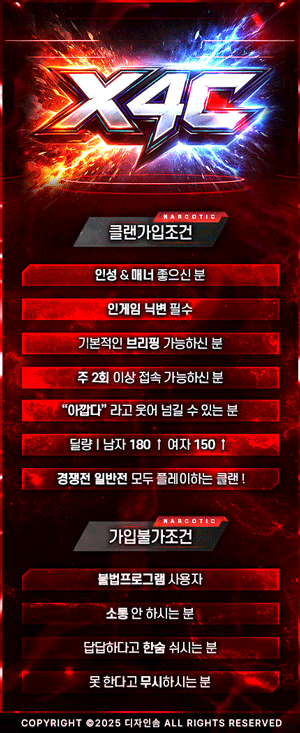 새롭게 리뉴얼된 X4C 신규 클랜원 모집중 ! 디스코드/인게임 닉변필수 / 배린이 복귀 직장인 학생 대환영 !![]() ![]() 디스코드 문의 : https://discord.gg/YVAyR8CBS