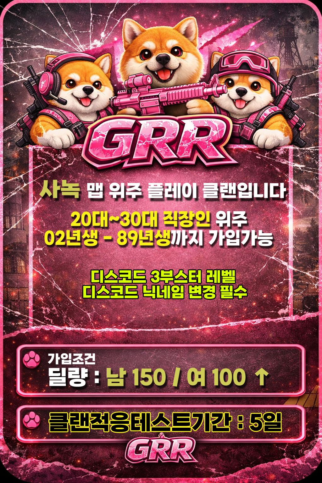 ❤️카카오배그 그르르[ Grr- ]❤️@ 사녹위주클랜 @ 20대중반 ~ 30대 위주로 구성 대다수 직장인!성인 매너 중심 · 팀플 위주 클랜즐겁게, 스트레스 없이, 분위기 좋게 게임하기 위해 운영되는 클랜입니다![]() ❤️카카오배그 그르르[ Grr- ]❤️@ 사녹위주클랜 @ 20대중반 ~ 30대 위주로 구성 대다수 직장인!성인 매너 중심 · 팀플 위주 클랜즐겁게, 스트레스 없이, 분위기 좋게 게임하기 위해 운영되는 클랜입니다성인 매너 중심 · 팀플 위주 클랜 즐겁게, 스트레스 없이, 분위기 좋게 게임하기 위해 운영되는 클랜입니다. 실력보다 인성과 매너, 소통을 더 중요하게 생각합니다. 억지 텐션 ❌ 훈수 분위기 ❌ 남탓 문화 ❌ 편하게 오래 같이 게임하실 분들 모집합니다. 💛 가입 조건 💛 ✔ 남/여 03년~89년생 ✔ 디스코드 사용 가능하신 분 ✔ 말없이 게임 ❌ (기본적인 소통 가능하신 분) ✔ 상호 존중 가능하신 분 ✔ 남 150이상 여100 이상 ※ 2주 이상 미접속 시 정리될 수 있습니다. 🚫 이런 분들은 정중히 사양합니다 핵 사용 이중 클랜 활동 과도한 욕설 실력 비하 / 지속적인 훈수 / 한숨 / 남탓 남미새 / 여미새 / 분위기 흐리는 행동 적발 시 즉시 정리됩니다. 💬 이런 분들 환영합니다 🔹 팀플 위주로 즐기시는 분 🔹 랜쿼드에 지치신 분 🔹 분위기 좋은 성인 클랜 찾으시는 분 🔹 오래 같이 하실 분 📝 가입 방법 가입 디스코드 : https://discord.gg/J52f2ZH6CD