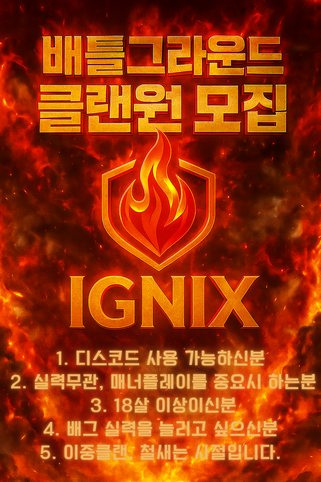 [IGX] 리뉴얼 후 신규 클랜원 모집중ㅣ실력,딜량 무관ㅣ일겜,경쟁ㅣ배린이,고수 환영ㅣ18살이상ㅣ![]() 들어오셔서 가입신청서 작성해주시면 됩니다! -> 양식은 오른쪽 상단 압정모양 아이콘을 누르시면 나옵니다 ※ 이중클랜, 부계, 철새는 받고 있지 않습니다 ※ (퇴장조치 당하실 수 있으니 유의해주시기 바랍니다.)