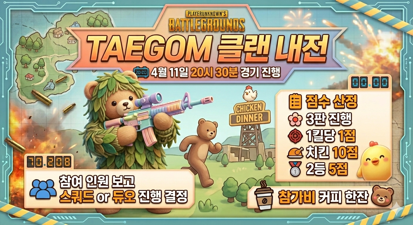 배린이 전용 태이고를 지키는 곰[ 태이곰 ]에서 행배하실 배린이 곰탱이분들 모집 합니다.!!!안녕하세요!! 스팀클랜 태이곰 입니다~ 👐 배린이지만 편하고! 즐겁게! 눈치 안보고 배그를 하고싶으신분!!! ❗️❗️태이고를 많이 하지만 태이고만 하지 않아요❗️❗️ 클랜 레벨 : 13 (S클래스 보급품) 인원 : 현재 56명 🐻[저희가 찾는 사람]🐻 배린이!! 딜량 200이하 찐 배린이 (배린이를 존중하고 행복배그 하실분만 딜량상관 X) 빡세게 말고 진짜 적당히 성장하고 싶은 의지✊ 혼자하면 공포겜으로 느껴지시는분😱 즐겁게 눈치 안보고 하실분🤟🏻 마우스만 잡으면 활력이 돋는분💪 🐻[이런분들 싫어요]🐻 기만자: 부캐로 배린이인척 하시는 분 극혐 예민 하신분😤 각종 미새 👩❤️💋👨 선비🤥 훈수충 🗣️ 정치질 👬 남탓충, 한숨충 😮💨 킬뎃 및 딜로 등급 나누시는 분 싫어요!!!!! (행복배그는 킬과 딜순이 아니자나요) 🐻신생이나 다름없는 클랜이라 다같이 읏쌰읏쌰하는 분위기에서 여유롭게 스트레스 받지 말고 게임하시면 어떨까요!! https://open.kakao.com/o/gbv6OsRh 🐻매주 클랜 내전 진행합니다