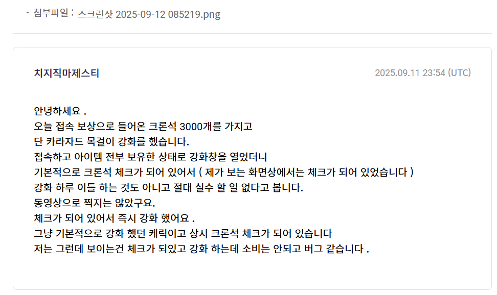 위의 버그와 일치하는 버그로 문의를 했던 유저분입니다. 전부 9월달에 문제가 발생 하고 있습니다 주목 하세요. 왜 갑자기 많은 사람들이 지금 이문제롤 문제 삼는 것인지 동시 다발적으로 이런 문제가 발생 하고 빈도가 높으면 이미 버그 판정하고 빨리 수정할 생각을 해야지 유저 탓으로 돌리고 있습니다. 강화 할때 녹화 하시구요. 녹화해도 해줄까 말까긴 합니다.