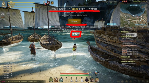낚싯대를 장착하면 해당 어장의 자원량이 표기 되고 스페이스바로 낚시를 시작합니다