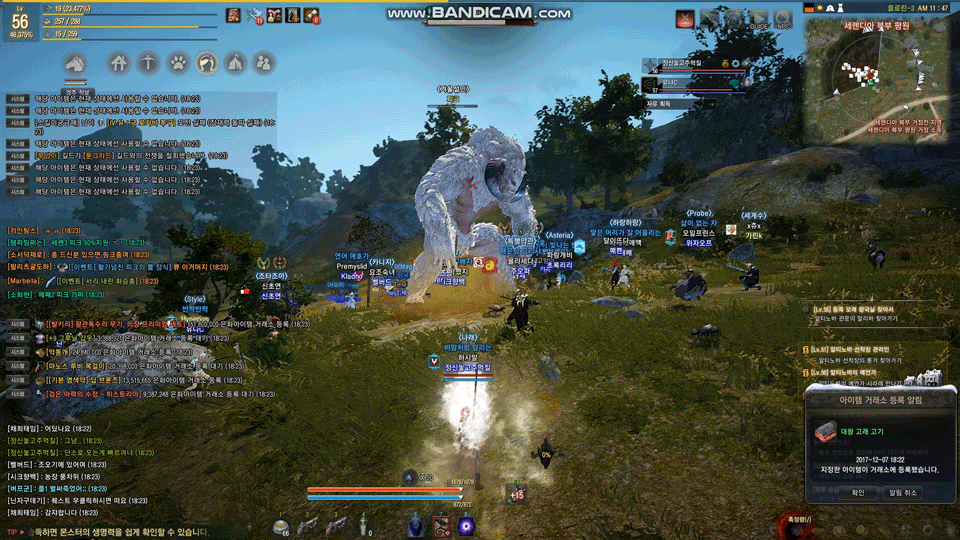 <가젤> <흑표범> <흑표범 :: 돌진> <흑표범 :: 물어뜯기> <흑표범 :: 앞발 찍기> <흑표범 :: 울부짖기> <흑표범 :: 할퀴기 / 두 번 할퀴기> <흑표범 :: 도망친 후 공격타이밍을 노린다> * 가젤 / 흑표범 수렵 시 루팅되는 아이템 - 수렵 경험치 - 화각 - 가젤 가죽 - 가젤 고기 - 흑표범 가죽 - 블랙스톤(무기) - 블랙스톤(방어구) - 뾰족한 흑결정 조각 - 단단한 흑결정 조각 - 가젤 머리 박제 - 흑표범 머리 박제 ------------------------------------------------------------------------------ * 깃털 늑대 / 프닐 - 프닐을 공격하면 주변의 깃털 늑대가 공격 성향을 띄웁니다. - 다굴을 당하기 쉬우므로 측면 이동 사격을 하거나 한마리 씩 유인하여 잡아줍시다. <깃털 늑대 / 프닐 위치> <깃털 늑대> <프닐> * 깃털 늑대 / 프닐 수렵 시 루팅되는 아이템 - 수렵 경험치 - 화각 - 늑대 피 - 늑대 고기 - 늑대 가죽 - 깃털 늑대 가죽 - 블랙스톤(무기) - 블랙스톤(방어구) - 뾰족한 흑결정 조각 - 단단한 흑결정 조각 - 늑대 머리 박제 - 프닐 머리 박제 ------------------------------------------------------------------------------ * 카마실비아 위즐 - 아케르 경비초소 모카사의 <당근줄게 열매다오> 퀘스트 완료 시 얻는 "달콤한 향이 나는 열매" 로 소환 <밀렵꾼의 탐욕스러운 제안> 퀘스트 연계로 받을 수 있습니다. (http://www.inven.co.kr/board/black/3584/33644) - 소환 시 3웨이브 까지 있으며, 웨이브가 진행될 수록 더 많은 카마실비아 위즐이 소환됩니다. - 위즐보다 주변의 코브라가 인식하지 않게 조심해야 합니다! (스샷의 위치에서 유인하여 싸우면 안전!) <모카사 위치> <달콤한 향이 나는 열매> <카마실비아 위즐> <카마실비아 위즐 전신 박제> * 카마실비아 위즐 수렵 시 루팅되는 아이템 - 수렵 경험치 - 화각 - 윤기나는 가죽 :: 100개 수집 시 카마실비아 위즐 전신 박제와 교환 (밀렵꾼 제리모) - 블랙스톤(무기) - 블랙스톤(방어구) - 뾰족한 흑결정 조각 - 단단한 흑결정 조각 - 카마실비아 위즐 전신 박제 ------------------------------------------------------------------------------ ![]() * 수렵 보스몬스터는 화면 우측하 총모양에 마우스를 가져다 대시면 현재 채널의 보스 현황이 나옵니다! * 점검 후 보스 시간대가 초기화 됩니다. 1) <대왕> 고래 - 대왕 고래는 총 세 가지 종류로 나누어 출몰합니다. 1) 발레노스 고래 [크론 / 발레노스 군도 / 녹스 / 아르샤 / 올비아 / 반토 해역] 2) 메디아 고래 [아르샤 / 엘토르 해역 / 소산 군도] 3) 칼페온 고래 [피욘 / 에페리아 / 아르모 / 올비아 해역] - 현재 고래 공팟에서는 발레노스 고래만 잡고 있으며, 가끔 메디아(소산) 고래를 잡기도 합니다. * 대왕 고래에 대하여 알아야 할 것 (17-10-21 기준) - 고래에는 어선을 이끄는 선장님 1명과 딜러 24명 총 5파티(1+24명) 까지 모집합니다. - 5파티 이상의 인원이 딜을 할 경우 5파티까지 딜 순위를 메겨 6위부터는 루팅 권한이 없습니다. - 시스템에서는 1순위~5순위 까지 루팅 템 차이가 있다곤 하지만 아주 미미하기 때문에 신경쓰지 않아도 됩니다. (자기만족 입니다ㅎㅎ) - 격수들은 어선의 뱃머리에서 앉아쏴(스페이스바)를 한 상태에서 고래의 꼬리(약점)를 조준하여 쏩니다. - 앉아쏴를 할 경우 시야거리와 화승총 장전 속도 등이 상승하므로 꼭 앉아주세요! - 자연사방지 인원은 고래의 루트를 외우는 것이 좋습니다. - 자연사방지를 하는 방법은 세 가지가 있습니다. (자연사 방지할 때 보스 피가 보이는지 확인해야 합니다.) 그러나 자방 시 범선 충각으로 해주시기 바랍니다. (나머지는 오래 걸립니다.) - 고래 순간이동이 패치되면서 가까이 오면 공격을 하는 패턴이 추가되었습니다. * 자연사 방지 방법 1) 화승총 딜 - 범선이나 어선 위에서 화승총을 사용하여 고래 피를 보입니다. 2) 고래 등에 올라타 공격 - 고래 꼬리가 내려갔을 때 고래 위에 올라와 등에 올라갈 수 있습니다. 이 때 공격으로 고래 피를 보입니다. 3) 범선 충각 - 고래의 루트를 파악하고, 충각 각을 잰 다음 Q를 눌러 충각을 하여 고래 피를 보입니다. - 혹시나 데미지가 들어가지 않을 상황을 대비해 3번 정도 반복 해줍니다. * 대왕 고래 충각 영상 * 고래 지도 정보 - Seria 님의 '[수렵] 대왕고래 수렵에 대한 모든 것' 글 참조 ![]() * 자동 사격 ('갈리소포드'님 제보) - 마우스를 클릭하지 않고도 자동으로 사격이 가능한 기능입니다. - 사격 거리가 닿지 않으면 앞으로 이동하기 때문에 사격 거리를 유지해야 합니다.(배에서는 물로 뛰어듬) - 앉아 쏴 상태에서도 가능하기 때문에 고래 잡이를 할 때 아주 편하게 수렵할 수 있습니다. * 설정 방법 : ESC - 게임 설정 - 인터페이스 설정 - 마우스 - 마우스 이동 사용 체크(노란불) * 사용 방법 1) 목표물이 시야 거리 안에 있도록 이동 2) Ctrl 키 를 눌러 마우스 포인터를 활성화 3) 칼 모양 표시가 뜨면 왼쪽 클릭 한 번 4) 자동 공격 활성화 * 주의 사항 : Ctrl을 다시 눌러 마우스 포인터를 없애면 자동 공격이 해제됩니다. =================================================================================== * 발레노스 대왕 고래 수렵 팁 (17-10-19) - 발레노스 고래는 전 서버 동시 젠입니다.(오차 존재) - 대왕 고래의 리젠 시간은 18~24시간 입니다. - 점검 후 발레노스 고래 