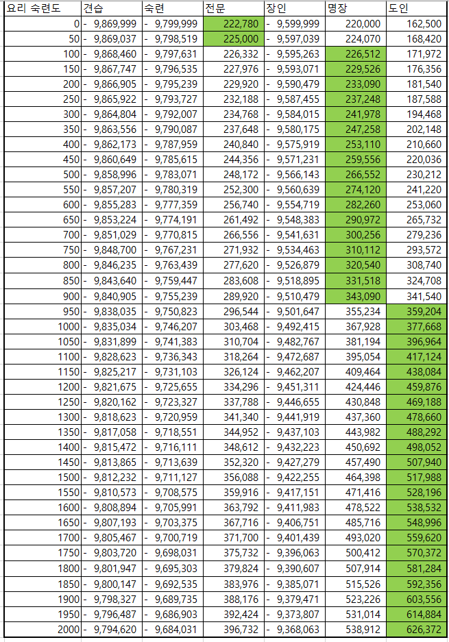 요리 숙련도에 따라 어떤 요리를 사서 납품할까?.excel위에 내용은 수정 전 내용이라 아래에 있는 산으로 가버린 내용을 봐주세요.