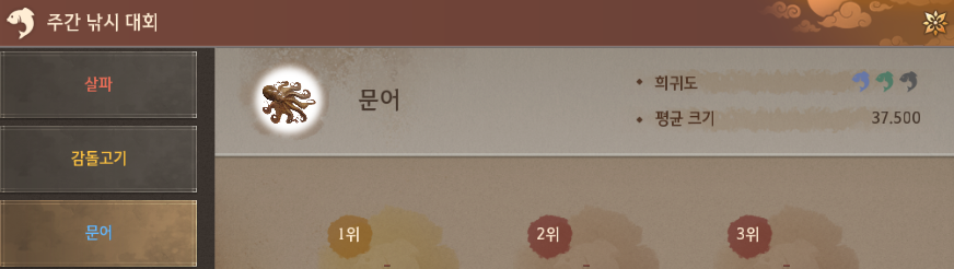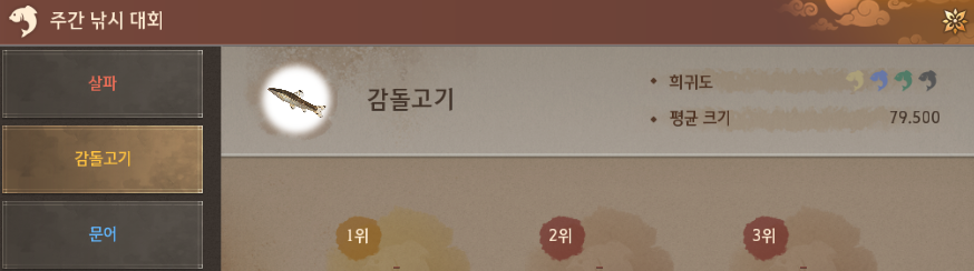 [3회차]주간 낚시 대회 어종별 낚시 위치_2025.04.20 ~ 04.26살파 - 보물 어종![]() 1. 메디아성 + 소산 군도 근처빨간색 구역: 살파(380,000,000),푸른갯민숭달팽이(750,000,000) 노란색 구역: 살파(380,000,000) ![]() 감돌고기 - 희귀 어종![]() 1. 트쉬라 폐허 + 히무트 벌목장 근처감돌고기,도라도(580,000,000) ![]()
