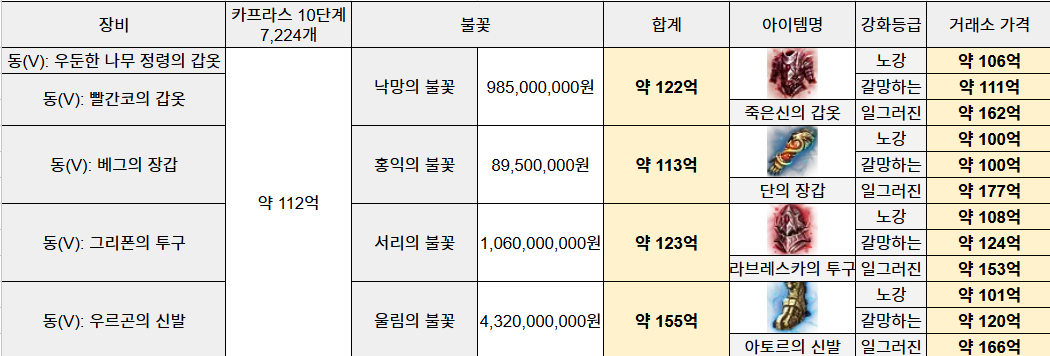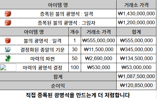 과거와 다르게 동(v)방어구 확정강화를 하지 않아도 되고, 카프라스의 돌 가격이 많이 내려오면서 정가와 제작 가격차이가 크지 않습니다. 상화에 따라서 이제는 제작하셔도 괜찮을 듯 합니다. 3. 증폭된 불의 광명석