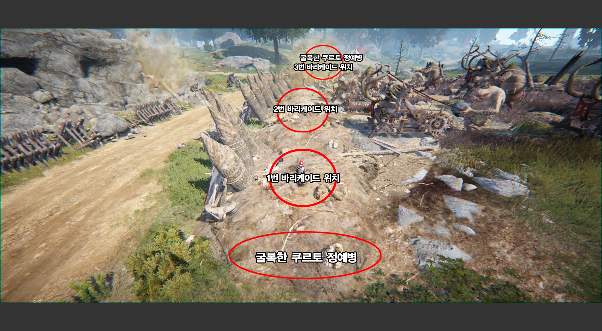우선 투석부대가 위치해있는쪽 나무 바리케이드들이 바로 지식이 따지는 바리케이드였는데.. 오잉? 왜 난 못봤지 하는 저같은 분들이 있다면.. 다음 스샷을 확인해주세요 ㅋㅋ ▼ 바리케이드와 굴복한 쿠르토 정예병의 리젠시간은 거의 동일