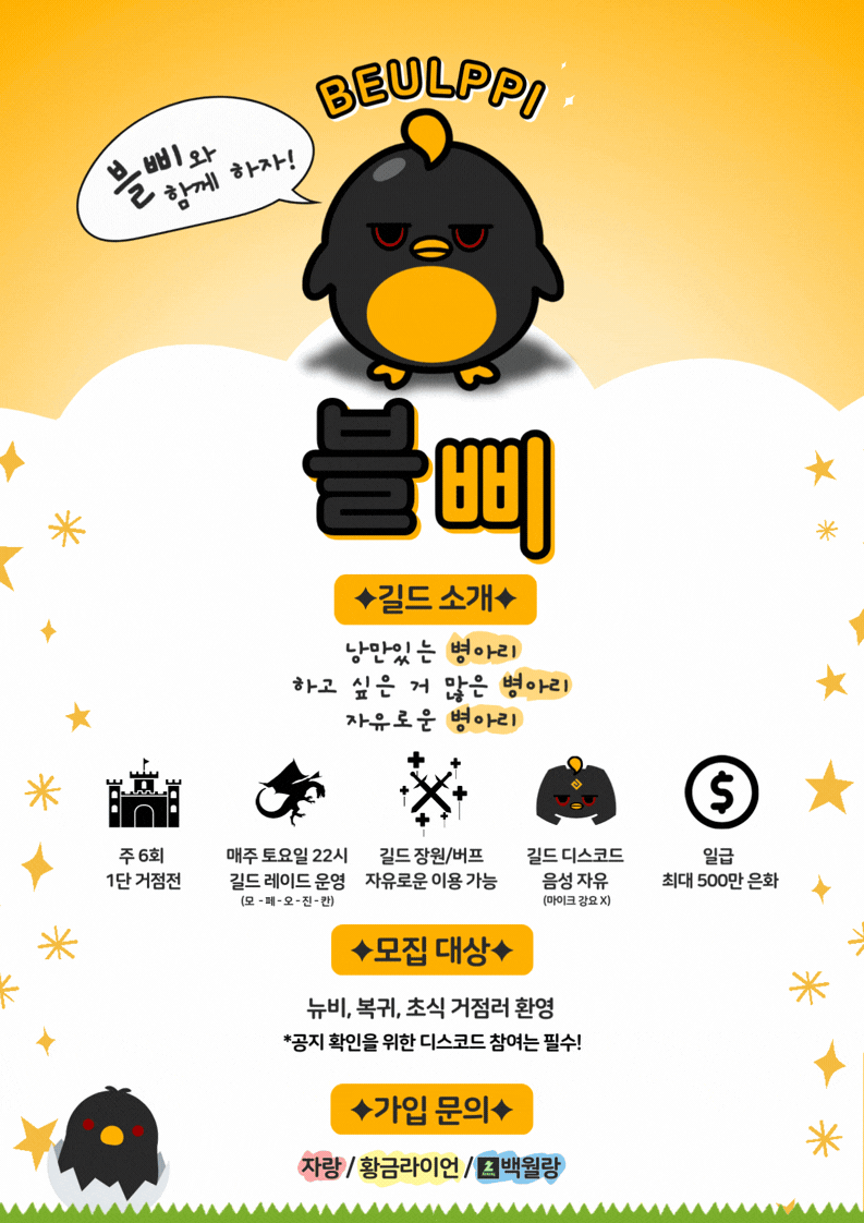 ✌블삐✌길드원을 모집합니다!!!🐣 참여보상단 연맹 🐣 주 6회 1단 거점(자율) 🐣 뉴비 복귀 초식 생활 거점 모험가 환영! 스펙 상관없음! 🐣 길드장원가구, 길드버프 자유롭게! 🐣 길드레이드 매주 토요일 22시 🐣 길드 디스코드 운영 🐣 가입문의(가문명) : 자랑, 황금라이언, 백월랑 그리고 블삐 길드원 아 무나!! * 연맹 T.O로 인해 정원 31인 소수정예 길드입니다