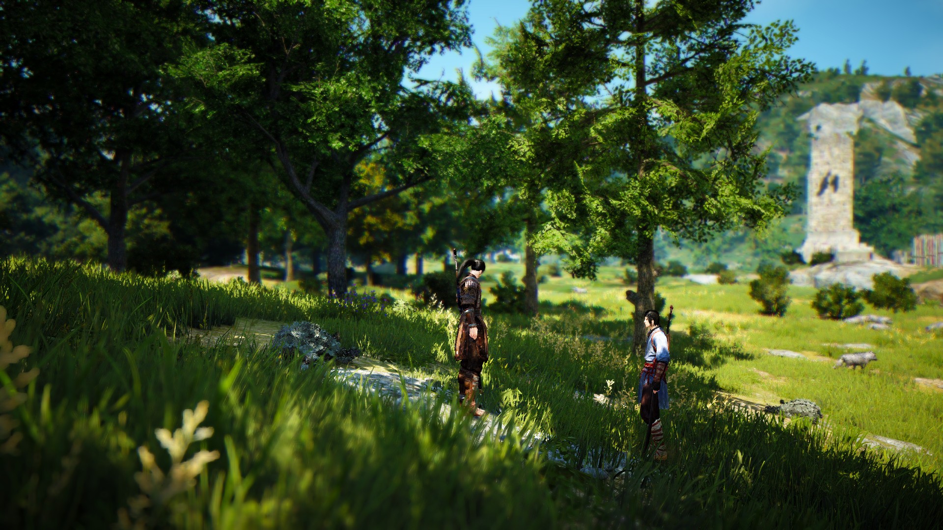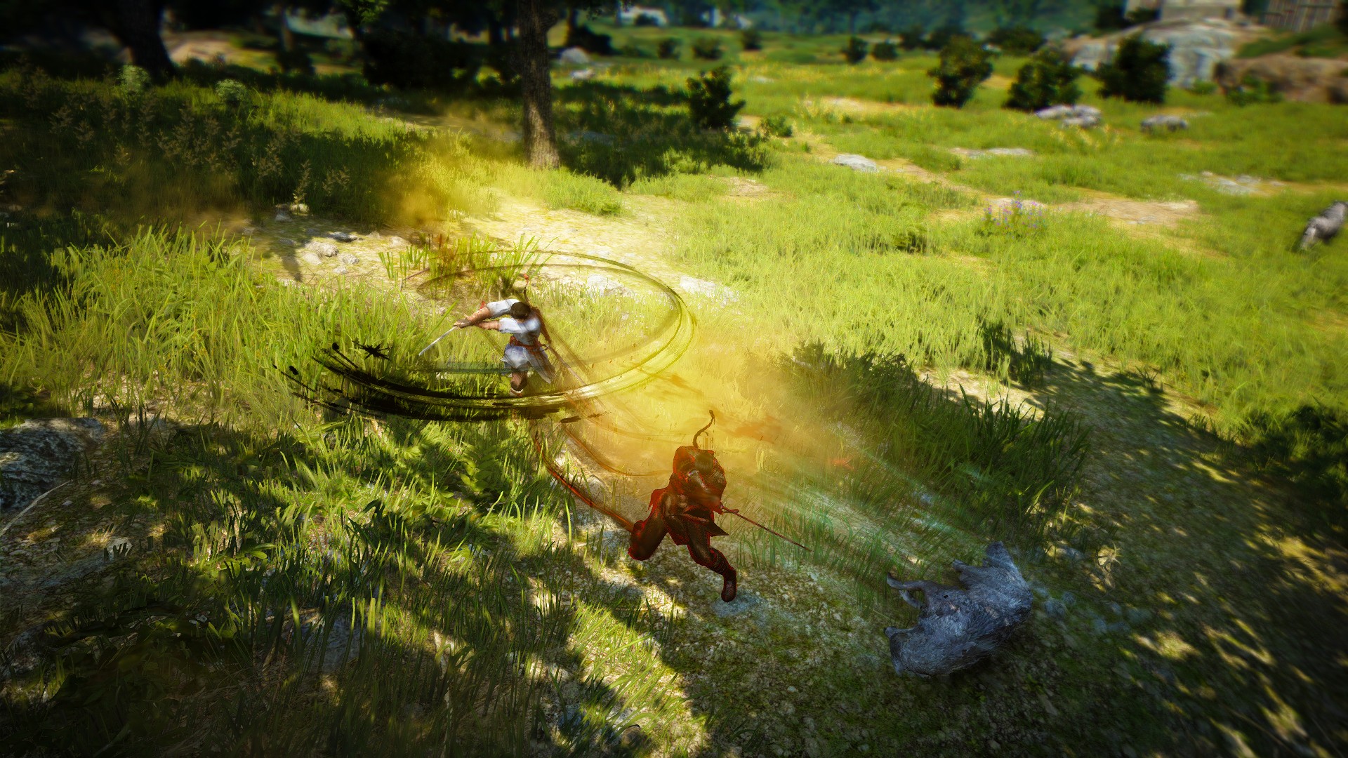 넓은 평야에 목검을 들고 대치하고 있는 두 명의 무인, 그리고 그 주변을 애워싸고 있는 화랑도들.