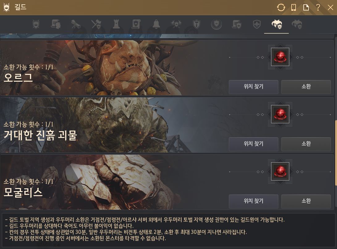 각 우두머리별로 지정된 소환 장소에서 길드 우두머리 UI를 통해 길드 대장 및 권한을 부여받은 길드원이 토벌 지역 입장 시, 길드 전용 토벌 지역이 생성됩니다.