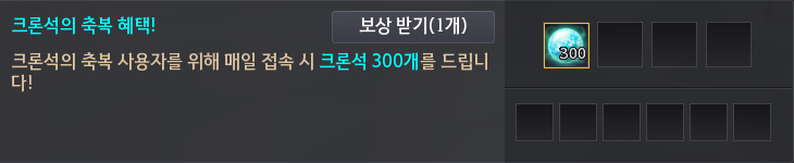 - 크론석의 축복 사용 시, 효과가 적용되는 기간(7일) 동안 매일 접속을 통해 도전과제(Y)에서 크론석 300개를 획득할 수 있습니다.- 크론석의 축복 사용 후 재접속해야 효과를 받을 수 있으며, 크론석의 축복 효과가 적용 중일 때 매일 자정 (00:00) 이후 도전과제를 수령할 수 있습니다. - 크론석의 축복 효과가 적용되는 기간 동안 게임에 접속하는 경우에 한하여 도전과제를 수령할 수 있습니다. - 효과가 활성화된 상태에서 크론석의 축복을 추가 사용하는 경우 남은 시간이 연장됩니다.