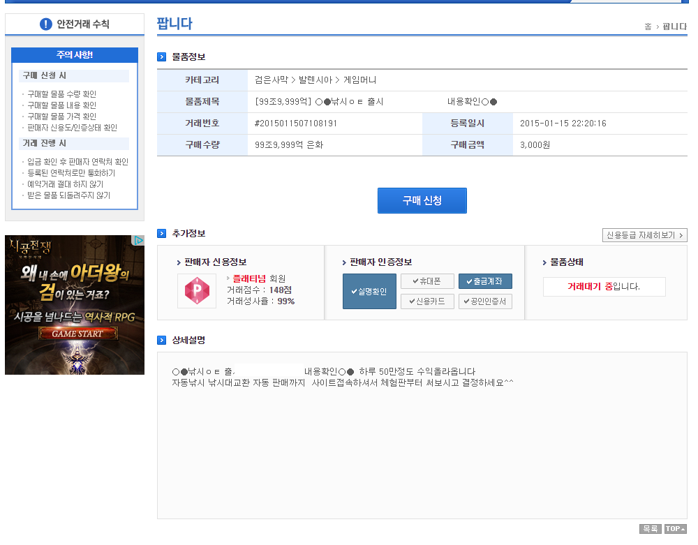 낚시매크로가 대놓고 판매되고 있습니다.검은사막 아이템 매니아가 있다고해서 타게임 아이템 판매하려다 한번 들어가봤습니다. 제 서버 판매글에 들어가보니 대놓고 낚시 매크로 판매한다는 글이 있더군요 ![]() 하루 50만 실버에 자동낚시,낚싯대까지 교환,자동판매까지 가능하다네요 무역레벨이랑 낚시레벨은 덤이겠죠? ![]() 사이트에 들어가보니 회원가입을 요구하더군요 ![]() 메뉴를 잘 보시면 리니지와 병행해서 판매하는 모습이 보입니다. 저 테스터코드는 일종의 데모? 같더군요 잘보시면 몇몇분들이 신청한 게시글도 보이네요 대부분의 메뉴탭,게시글을 눌러봤지만 "권한이 없는 레벨입니다." 라고 뜹니다 결제를 해야 사이트를 볼 수 있는듯.. ![]() 이런식으로 거래하는거 같은데 뭔 소린지 모르겠네요 프로그램에 코드를 등록하는거 같은데 아직 제대로 사이트를 수정하진 않았나보네요 ++++++덤 철저한 익명성(?)을 위해 남의 게시글은 안보이는.. ![]() 이런 사이트 이외에도 디씨 인사이드 갤러리에서도 배포한적이 있다고 들었습니다. 낚시매크로가 한두곳이 아닐꺼고 자기가 직접 만들어서 쓰시는 분들도 계시겠지요 누구는 미드 보면서 열심히 낚시질해서 전문 찍고 어떤 사람은 편하게 출근하거나 잘때 겜이랑 프로그램만 켜놔도 알아서 돈벌리고 낚시레벨도 오르고 참 공평하네요 ㅠㅠ + 사이트 이름과 주소는 문제가 있을것 같아 가렸습니다.