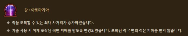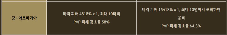 기술 사용 시 2초간 모든 방어력 증가 20, 잡기 저항 증가 30% 항목 삭제 대신 슈퍼 아머 상태일 때 받는 피해량 30% 감소되도록 변경 5) 강: 아토마기아