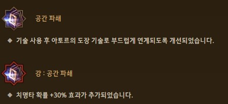 마법 방어력 감소에서 모든 방어력 감소로 효과 변경. +변경 이유: 기존 공격력 증가, 방어력 감소 효과가 타 캐릭터에 비해 컸지만 기술 피해량 증폭 수치는 낮아 이를 보완하기 위해, 방어력 감소 효과는 낮추고 기술 피해량 증폭 수치를 높임. 1025%->1640%로 615% 상향 3) 공간 파쇄