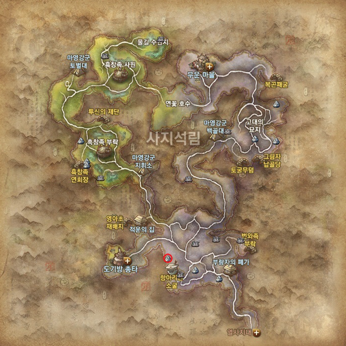 일반 성물에서는 1~3개, 풍부한 성물에서는 5~7개의 성물을 획득할 수 있습니다. 빨간색 동그라미가 풍부한 성물의 위치입니다. 빨간색 세모는 전 채널을 확인해 봤지만 성물이 없어 확인하지 못한 곳입니다. 확인하신 분이 있다면 댓글로 제보해 주시면 감사하겠습니다. 그 외의 성물은 전부 일반 성물입니다. 지도가 없는 지역은 일반 성물만 있는 지역입니다. 부유도는 지도상의 세 군데 모두 풍부한 성물로 추정됩니다. <제룡림 수련동> ![]() <제룡림 송암도> ![]() <대사막 사지석림> ![]() <대사막 오색암도> ![]() <수월평원 늑대구릉> ![]() <수월평원 반달호수> ![]() <수월평원 안개숲> ![]() <백청산맥 부농촌> ![]() <백청산맥 강류시> ![]() <백청산맥 자작나무 숲> ![]() <백청산맥 북방설원> ![]() |