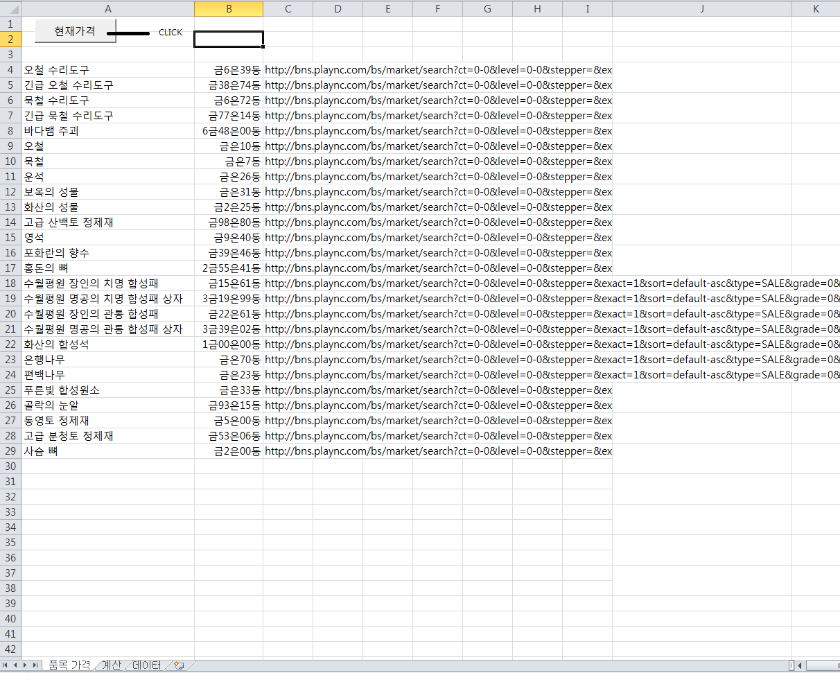 후꾸시마 님의 파일을 사용해보신분들은 아시겠지만 위의 "현재가격"버튼을 클릭하시면 현재 블소 홈페이지 시장에서 검색된 가격이 업데이트 됩니다