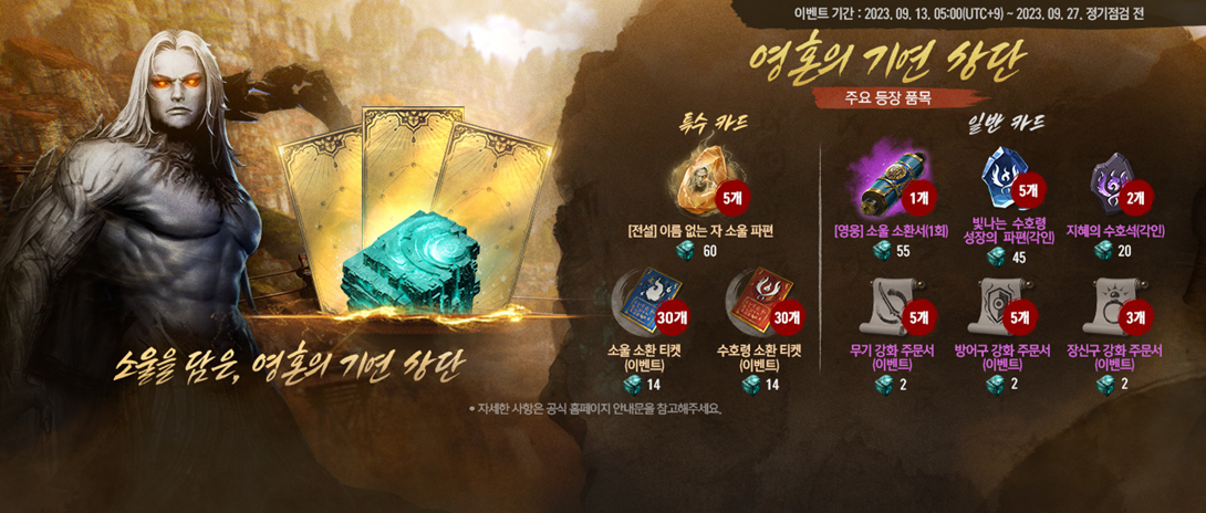 소울 소환 티켓(이벤트) | 30 | 14 | 계정당 주간 1회 | 1.50000% |