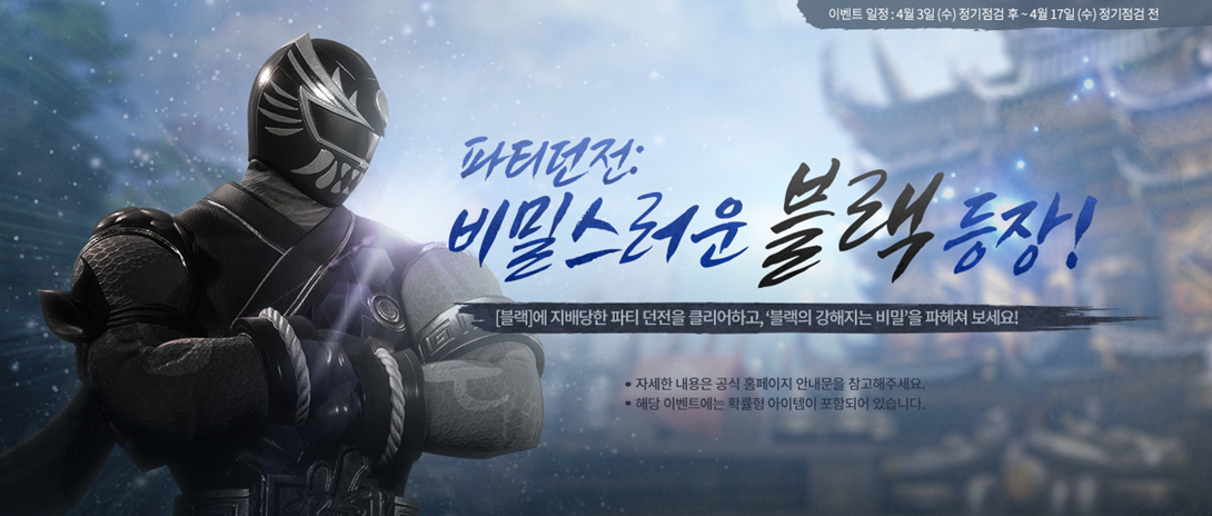 파티 던전: 비밀스러운 블랙 등장! (공통)액션 MMO의 시작, 블레이드 & 소울 2 안녕하세요, 블레이드 & 소울 2 입니다. “이제부터 파티 던전은 이 [블랙]님이 지배한다 강함의 비밀이 궁금하다고!? 그럼 나를 쓰러트려 보시지!” 파티 던전에 강함의 비밀을 숨기고 있는 ‘비밀스러운 블랙’이 등장했습니다. 이벤트 기간 동안 파티 던전에 등장하는 ‘비밀스러운 블랙’을 처치하고 푸짐한 보상을 획득해보세요! ■ 이벤트 일정 - 비밀스러운 블랙 등장 기간 : 2024년 4월 3일(수) 정기점검 후 ~ 2024년 4월 17일(수) 정기점검 전 (2주) - [블랙의 강해지는 비밀] 제작 기간 : 2024년 4월 3일(수) 정기점검 후 ~ 2024년 4월 24일(수) 정기점검 전 (3주) EVENT 1. 블랙이 지배한 파티 던전을 클리어하라! 이벤트 기간동안 바다뱀 보급기지 이상의 구역에서 [비밀스러운 블랙]이 깜짝 등장합니다. [비밀스러운 블랙] 처치 시 성장에 도움되는 아이템을 획득할 수 있고, 파티 던전 완료 시 ‘블랙의 강해지는 비밀(이벤트)’ 아이템을 획득할 수 있습니다. ■ 블랙 처치 보상 - 파티 던전 에서 블랙 처치 시 아래 아이템을 모두 획득할 수 있습니다.
