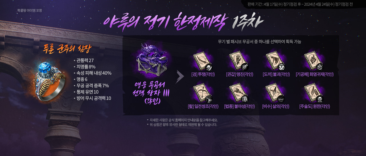- 상품 판매 기간 : 2024년 4월 17일 (수) 정기점검 후 ~ 2024년 5월 2일(목) 정기점검 전