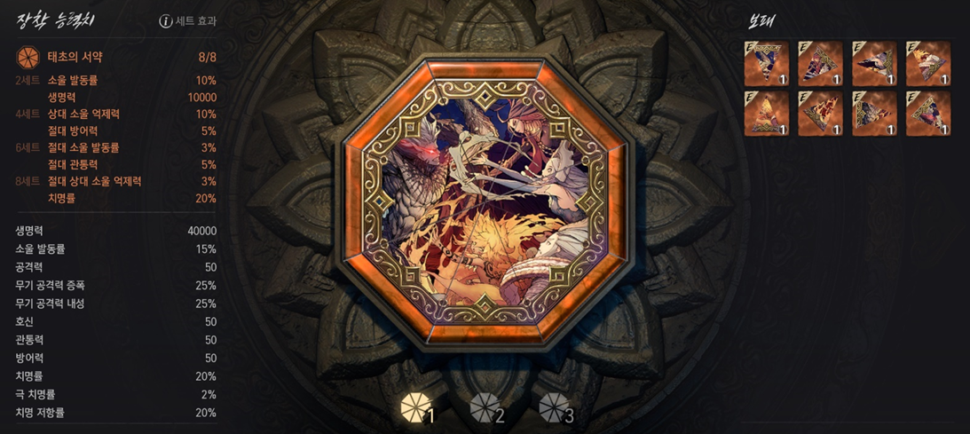 신규 전설 보패가 추가되었습니다. [극]찬란한 흑마영 보패와 제작 재료를 통해 신규 전설 보패를 획득할 수 있습니다. | 보패 | 능력치 | 세트 효과 | 태초의 보패 1번 | 소울 발동률 10% 생명력 재생 25 무공 공격 증폭 15% 생명력 5000 주는 피해량 증폭 3% | [태초의 서약] 2세트: 소울 발동률+10%, 생명력+10000 4세트: 상대 소울 억제력+10%, 절대 방어력+5% 6세트: 절대 소울 발동률+3%, 절대 관통력+5% 8세트: 절대 상대 소울 억제력+3%, 치명률+20% | 태초의 보패 2번 | 치명 저항률 20% 생명력 절대 재생 25 통제 저항률 15% 생명력 5000 절대 소울 발동률 3% | 태초의 보패 3번 | 공격력 50 물약 회복량 25 상대 소울 억제력 5% 생명력 5000 받는 피해량 감소 3% | 태초의 보패 4번 | 방어력 50 물약 회복률 7.5% 소울 발동률 5% 생명력 5000 불굴 20 | 태초의 보패 5번 | 호신 50 생명력 재생 25 무기 공격력 내성 25% 생명력 5000 절대 방어력 3% | 태초의 보패 6번 | 치명률 20% 생명력 절대 재생 25 무기 공격력 증폭 25% 생명력 5000 극 치명률 2% | 태초의 보패 7번 | 관통력 50 물약 회복량 25 무공 피해 내성 15% 생명력 5000 절대 상대 소울 억제력 3% | 태초의 보패 8번 | 상대 소울 억제력 10% 물약 회복률 7.5% 통제 적중률 15% 생명력 5000 절대 관통력 3% |